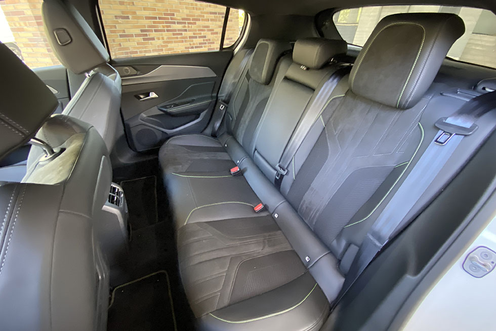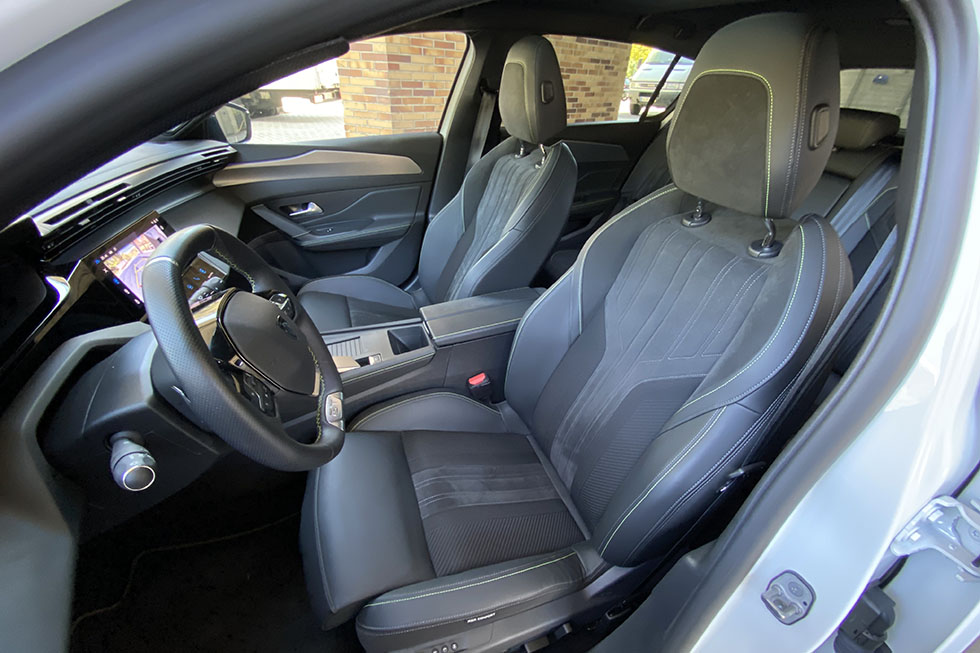 O ambiente sofisticado nesta versão GT é proporcionado pelos assentos em pele e tecido microfibras de visual mais desportivo, que até incluem costuras num tom esverdeado inspirado nos das versões Peugeot Sport Engineering. Os assentos AGR Comfort oferecem uma boa postura e um nível de conforto elevado, não faltando as regulações elétricas para os ajustar da melhor forma. E em termos de espaço disponível, o Peugeot 308 é como uma calças que nos estão justas, mas com as quais nos sentimos muito bem ao longo do dia, tanto nos lugares da frente como nos traseiros.