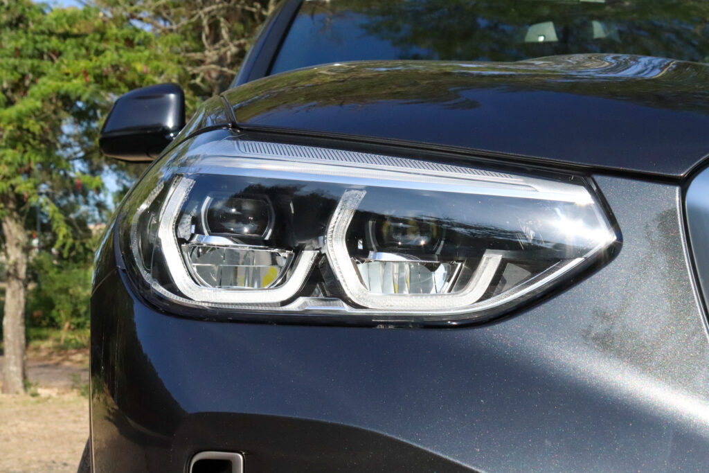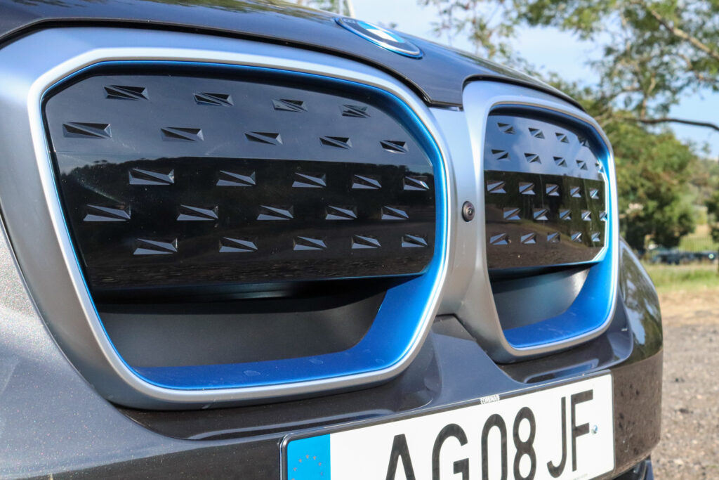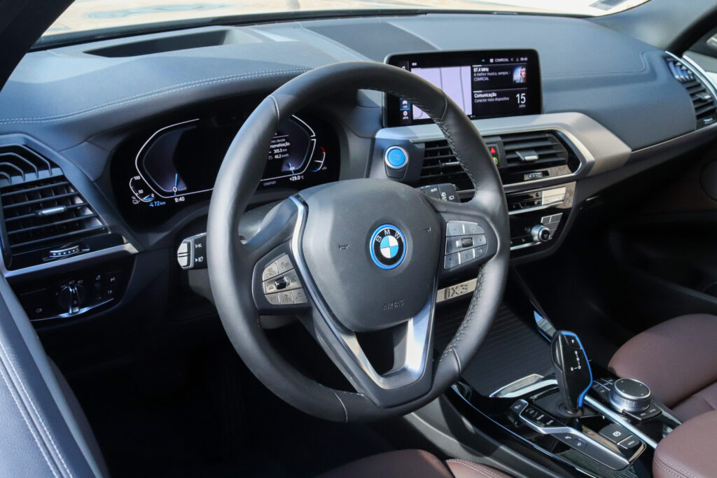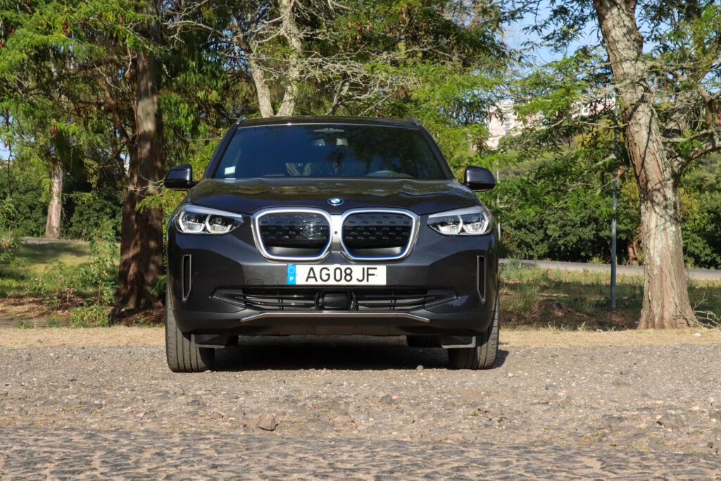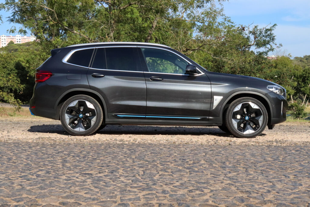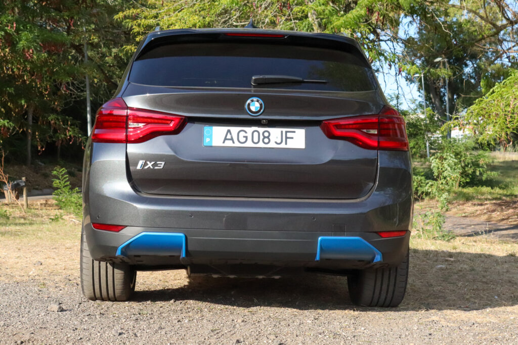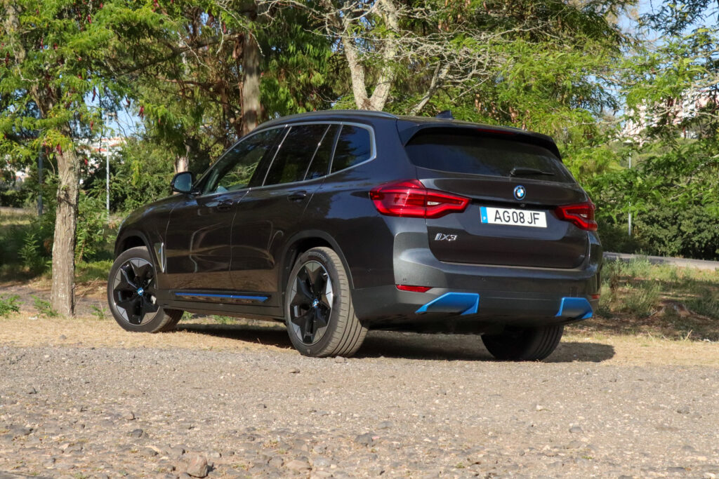 Exterior (8/10) Relativamente ao exterior, não são linhas desconhecidas na BMW. Com base no X3, modelo esse que tem provas dadas, conta apenas com alguns detalhes exclusivos que o diferenciam das restantes versões. De facto, o BMW iX3 dispensa a grelha frontal aberta em detrimento de um painel com pequenos relevos e, para além disso, diferencia-se pela utilização da cor azul em vários detalhes. É caso disso o rebordo da grelha dianteira, símbolos, inserções nos para-choques e nas laterais. Tudo isto acompanhado pela letra “i” nos guarda-lamas dianteiros e por um formato de jantes específica desta versão. De um modo geral é marcadamente um X3, mas com um “fato feito à medida” para esta versão elétrica.