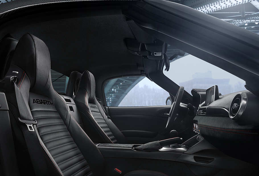 Como exemplo desta realidade, que até em muitos casos seria fácil de alterar, surgem as saídas de ar, o volante e respectivos botões (isto, apesar do escorpião, de dimensões generosas, surgir bem visível ao centro…), os comandos manuais do ar condicionado e até os (pouquíssimos) espaços de arrumação. Já para não falar no sistema de infotainment, o qual não só utiliza o mesmo ecrã e comandos rotativos do Mazda, como reproduz o mesmo layout e modo de funcionamento, por vezes excessivamente lento, do do MX-5. E, isto, apesar do construtor italiano já possuir, no seio das suas marcas, soluções bem melhores!…