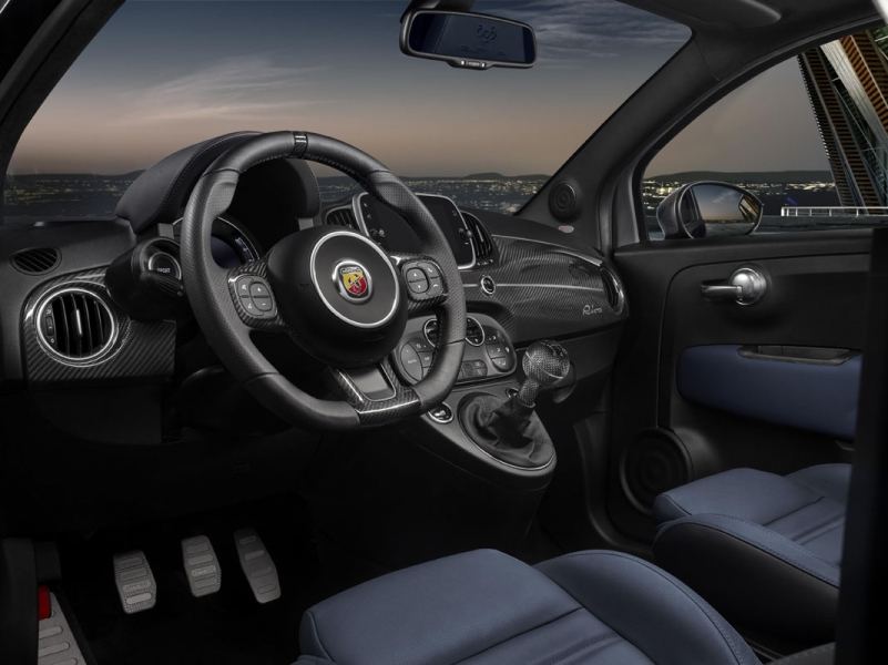 Aqui temos a mistura que mais confusão me fez. Aceito a pintura em dois tons, o tejadilho de abrir e o facto deste ser um Abarth, apesar de tudo, discreto, algo que não acho natural. Mas quando abri a porta e vi pele… azul a revestir os bancos e os forros das portas e, no tabliê, uma enorme peça de plástico a imitar a madeira do painel de instrumentos de um Riva Aquarama. Meu deus!!!! Escutar o melodioso som do escape Akrapovic a olhar para madeira e não fibra de carbono… custa horrores! Percebe-se a homenagem, já feita na série especial Riva, aos barcos italianos, mas.. Depois há mais madeira no pomo da alavanca da caixa de velocidades, no volante, enfim há madeira em todo o lado. O espaço, como sempre, é um bem escasso. O resto é “business as usual”.