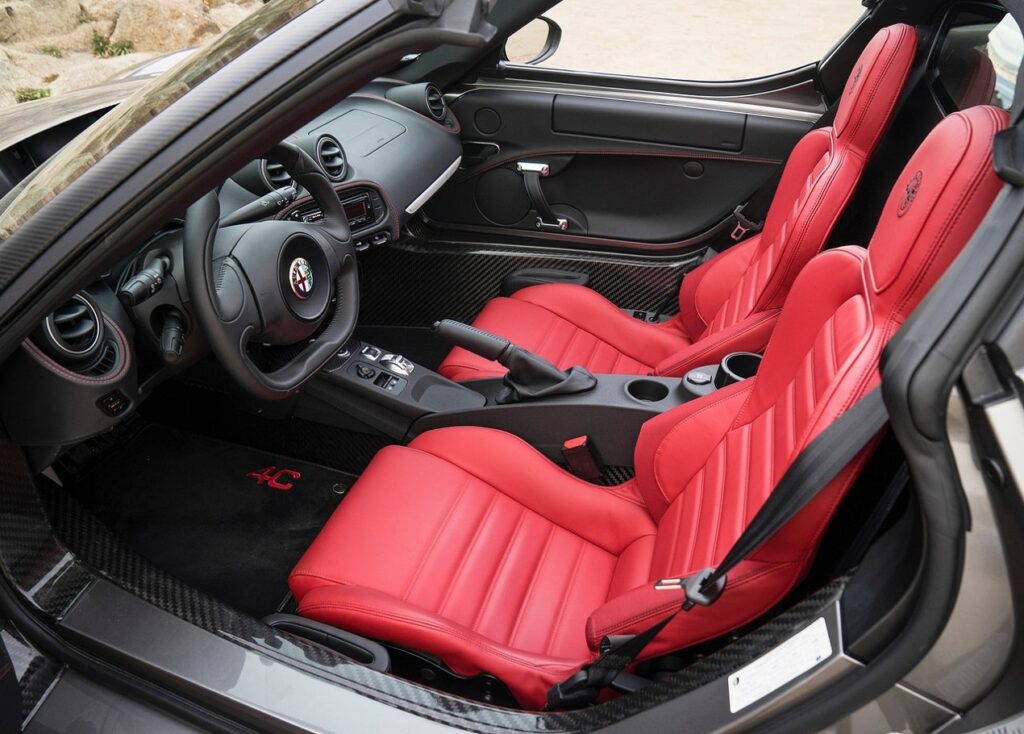 O Alfa Romeo 4C Spider Italia não tem opcionais e o equipamento é reduzido. Para lá do sistema de som Alpine “aftermarket”, tem ar condicionado manual, volante regulável em altura e profundidade, espelhos retrovisores com regulação elétrica e desembaciamento, jantes de liga leve de 18 polegadas, sistema “launch control”, pedais em alumínio, pintura azul Misano, cruise control, sensores de estacionamento traseiros e escape Akrapovic. E é só!