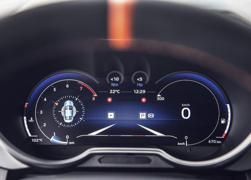 Curiosamente, não é acanhado e o estilo é muito agradável. A consola central flutuante onde estão os três botões D N R (Drive, Neutral, Reverse) para seguirmos em frente, colocar em ponto morto ou fazer marcha atrás, o botão para ligar o motor, o travão de mão elétrico (não gostei!!!) e os comandos dos vidros, é uma delicia. O painel de instrumentos é digital e assume várias configurações consoante o modo de condução e no volante do mais belo efeito – de dimensões corretas e boa pega – está o botão que dá acesso direto ao modo Sport.