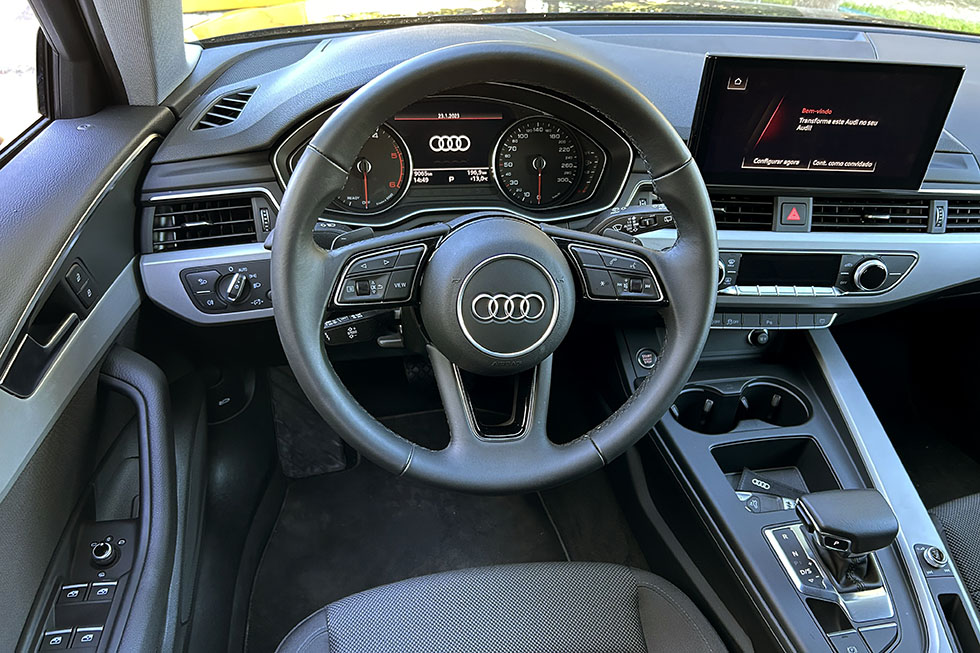 A primeira impressão que temos assim que nos sentamos ao volante da Audi A4 é de que este modelo está muito longe de revelar que já se encontra há uns bons anos no mercado, ou que chegou um pouco antes do seu tempo. O patamar de qualidade é bastante elevado, mesmo quando tentamos ir ao pormenor e o desenho, de uma forma geral, apresenta um toque de originalidade, mas sem entrar no arrojo. Onde já se nota o passar dos anos é na maioria dos comandos que já nos são tão familiares, estando presentes três hastes atrás do volante, além dos comandos da caixa de velocidades, ou mesmo os comandos do volante, que já vimos em tantos outros modelos e que, felizmente, ainda são físicos e não da geração tátil.