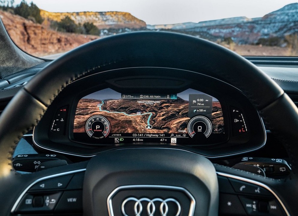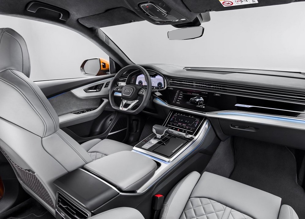 A Audi sempre fez interiores de qualidade e de muito bom gosto e não falhou com o Q8. Simplesmente fabuloso o habitáculo do Q8, forrado a pele e com um conjunto de três ecrãs que se complementam: um que funciona como painel de instrumentos (Virtual Cockpit), outro que alberga o sistema de info entretenimento e um terceiro onde, entre outras coisas, está o controlo do sistema de climatização. Os comandos são fabulosos ao toque, servindo uma ligeira resistência que adiciona a sensação de qualidade. Mergulhar nos vários menus dos sistemas pode ser assustador numa primeira abordagem, mas rapidamente percebemos como tudo funciona.
