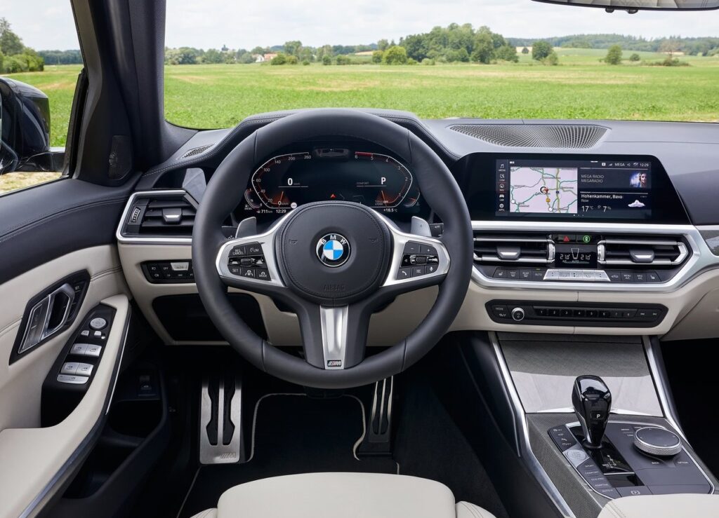 Como tem sucedido com os mais recentes BMW, o interior deste 320d é um autêntico festival de tecnologia. O painel de instrumentos é digital – não, não vou voltar a dizer que os grafismos são feios e pouco legíveis… mas é a minha opinião! – e na versão de topo tem 12,3 polegadas e toneladas de informação. Depois, há o ecrã central com 10.25 polegadas onde habita o sistema operativo “BMW OS 7.0” que oferece o “BMW Intelligent Personal Assist”, ou seja, “olá BMW!” Sim, é um sistema de controlo de voz que fala connosco. Há “head up Display”, o tabliê não é um exercício de estilo fantástico – a zona dos comandos da climatização e das saídas da ventilação, são peças de estilo e pouco práticas – mas tem qualidade e, sobretudo, recuperou aquilo que sempre foi uma tradição na BMW, tudo o que é informação que não esteja á sua frente, fica inclinado para o condutor. Nem tudo foi remetido para as funções digitais e ainda há um bom número de botões físicos. Menos feliz é a opção da BMW em oferecer cinco formas diferentes de fazer a mesma função. Confuso sem necessidade. O sistema de controlo por voz funciona muito bem, tal como o sistema de navegação, com a particularidade de poder alterar a saudação “Olá BMW” para “Olá qualquer coisa” que entenda. Por exemplo, pode dar um nome ao seu carro ou à voz que o assiste. A BMW permite fazer isso.