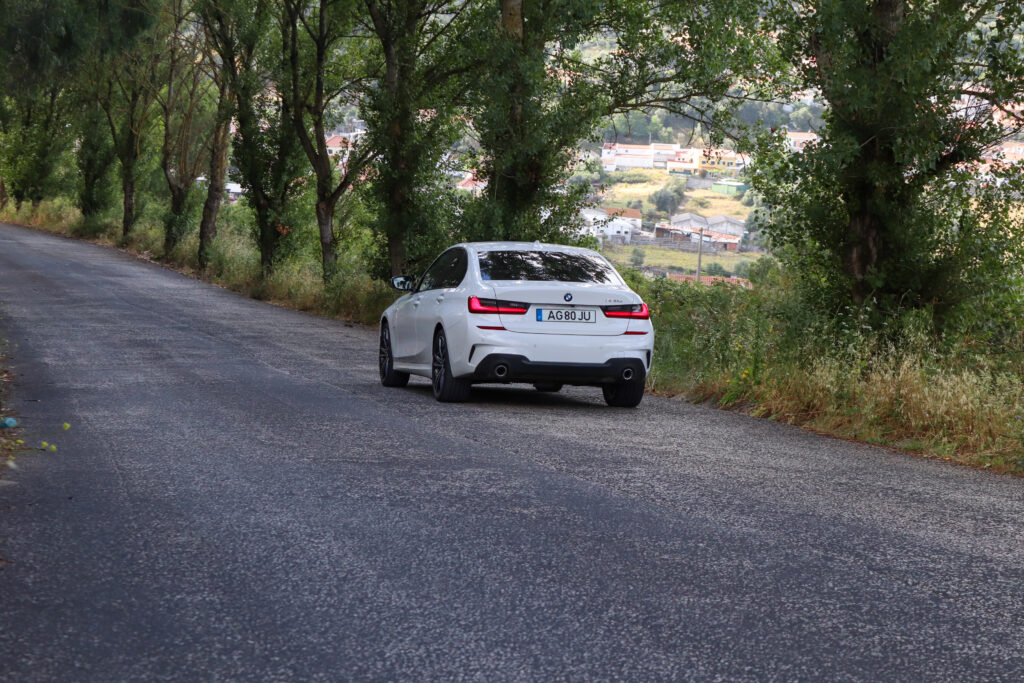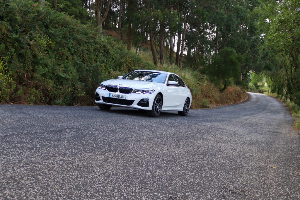 A suspensão adaptativa varia consoante o modo de condução, contudo, apresenta-se sempre com uma afinação firme. Ainda assim, de ressalvar que o conforto não sai prejudicado por esta dureza superior que apenas é sentida em trajetos mais degradados. Quando selecionado o modo Sport e percorrendo uma estrada mais sinuosa, rapidamente percebemos o porquê do BMW Série 3 ser uma das referências do segmento ao nível da dinâmica. Com uma direção rápida e precisa, acompanhado por um pisar robusto e movimentos de carroçaria controlados, o condutor consegue ter uma condução divertida neste tipo de trajeto, mesmo só contando com 204 cv nesta versão 320e. A tão característica tração traseira da BMW permite ainda, mediante o desligar do controlo de tração, uma traseira “atrevida”, mas que desliza sempre com sensação de segurança.