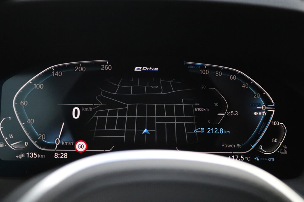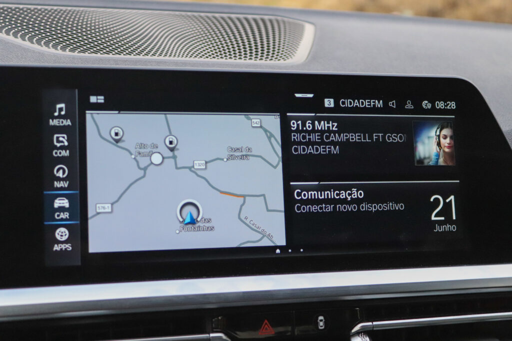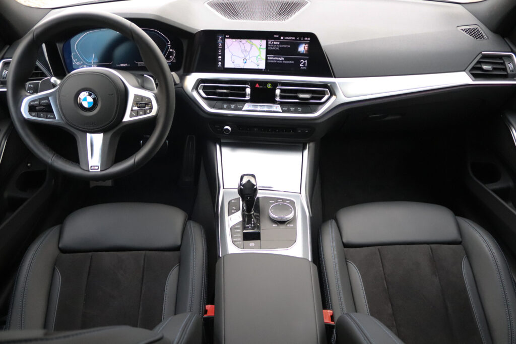 O tablier apresenta um desenho simples, mas eficaz, onde se destacam o painel de instrumentos digital e um ecrã tátil central onde são transmitidas todas as informações do sistema de infotainment. Este mostrou-se bastante intuitivo e fácil de utilizar. Uma novidade em relação às versões a combustão pura é a inclusão de um menu específico para a tecnologia híbrida onde podemos ver, por exemplo, um gráfico com o fluxo de energia do 320e em tempo real. Algo que também merece destaque é a manutenção de botões físicos para comandar as principais funções do sistema, bem como, da climatização, algo que facilita a sua utilização durante a condução.