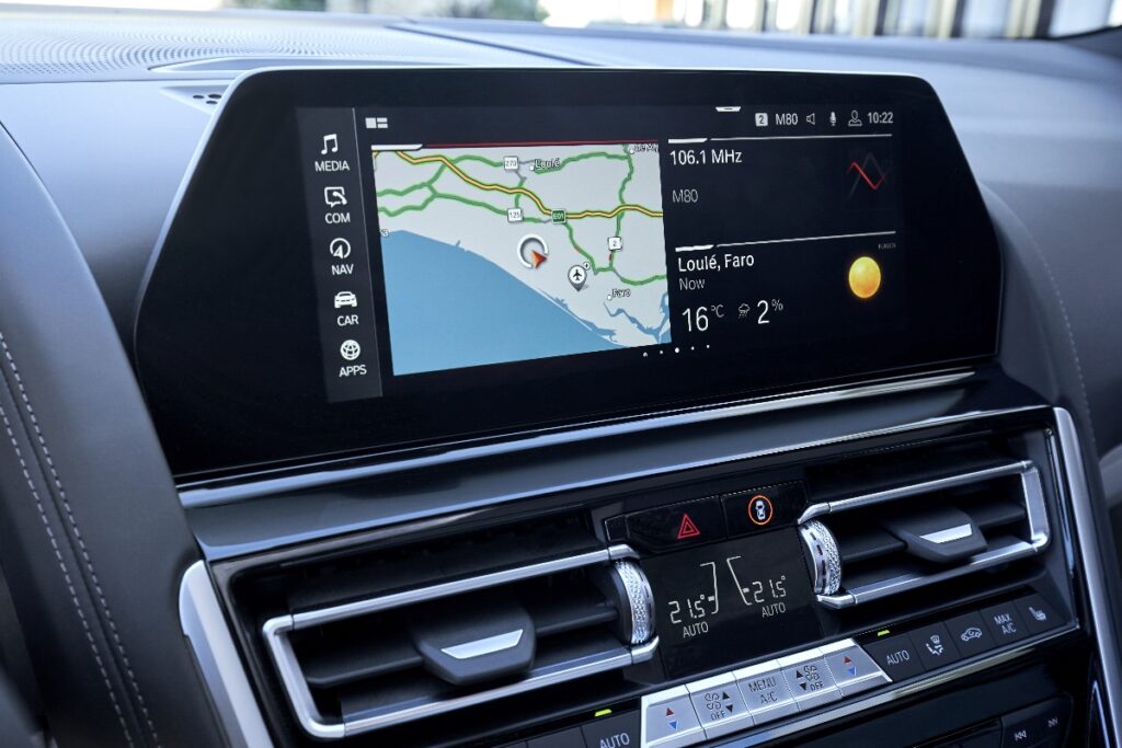 Interior (8/10) No interior, a BMW teve uma preocupação especial em garantir uma qualidade de construção, praticamente irrepreensível neste topo de gama. Desde os materiais de boa qualidade aos bancos desportivos em pele, o resultado final é um visual moderno, mas ao mesmo tempo confortável. Os bancos apresentam várias soluções de ajuste, algo que ajuda a conseguir uma posição mais correta ao volante. À frente o espaço é suficiente, mas atrás é ligeiramente curto para pernas. Para além disso, todo o mecanismo de abertura da capota deste cabrio faz com que o espaço para ombros seja mais reduzido na segunda fila de bancos, enquanto a bagageira perde volumetria face ao coupé (350 litros, menos 70 litros do que no Coupé). Destaque para o novo comando da caixa automática com vidro trabalhado e um “8” iluminado no interior, um toque de luxo e requinte que dá nas vistas na consola central. No que diz respeito a tecnologia, a BMW apostou forte no Série 8. À frente do condutor surge o painel de instrumentos digital de 12,3 polegadas e ao centro do tablier encontramos um ecrã tátil com o mais recente sistema de infotainment que, durante o nosso ensaio, demonstrou ser intuitivo e bem organizado. De referir ainda que a BMW optou por manter botões físicos para controlar praticamente tudo no veículo, algo cada vez mais raro nos carros atuais, principalmente quando se fala de um topo de gama, porém, é um detalhe que divide opiniões, há quem goste e quem odeie.