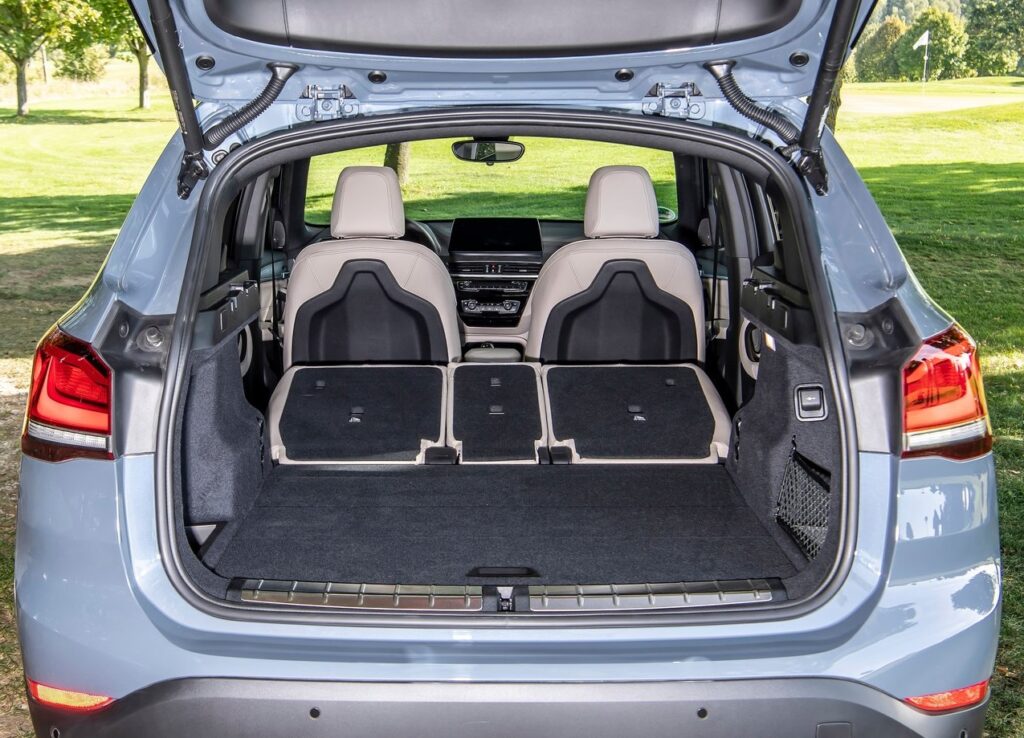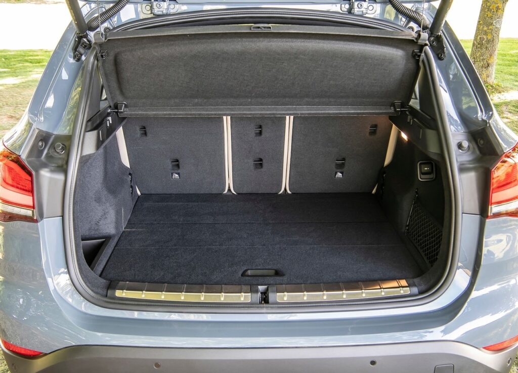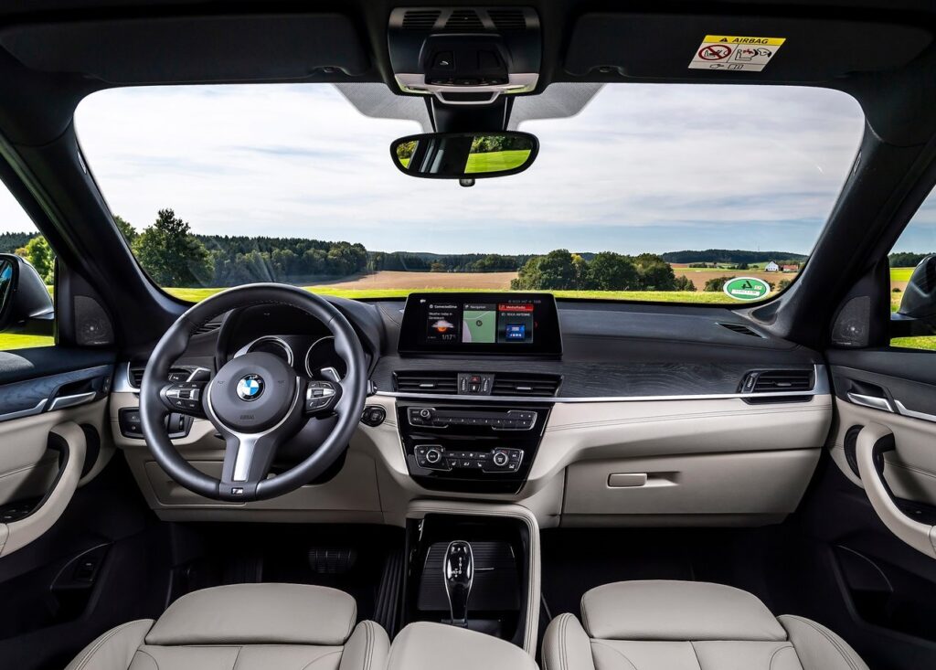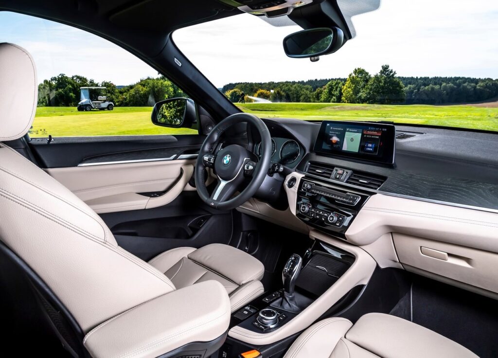A mudança mecânica foi fundamental para dar ao X1 melhores argumentos na luta dos crossover. Com o motor transversal e a plataforma UKL, a BMW encontrou mais espaço interior, de tal forma que o X1 tem mais espaço interior que um Qashqai. Vamos sentados 30 mm mais acima que no anterior X1, mas o espaço oferecido impressiona, tanto em altura como em largura e para arrumar as pernas. E como o banco desliza sobre calhas, podemos ficar com um verdadeiro salão. Com as costas do banco traseiro a rebaterem na proporção 40/20/40 e o movimento do banco, a bagageira é enorme. E como pode optar pelo rebatimento das cotas do banco do pendura, o X1 toca todas as necessidades em termos de versatilidade e funcionalidade. O plano da bagageira fica totalmente plano e há 505 litros de capacidade. Os materiais utilizados são de qualidade, suaves ao toque seja plástico ou alumínio e descendo até á consola central, aos forros das portas, coluna de direção e outros locais, essa qualidade mantém-se. Em locais que raramente atingimos ou sequer conseguimos ver, há plástico de menor valia, mas que não criam problemas de ruído. Há muitos espaços para arrumação, mas já começa a sentir-se a necessidade de renovar o interior, pois não há espaço para algumas coisas. Nomeadamente, mais ligações USB, AUX e tomada de energia de 12 volts, carregamento sem fios, enfim, algo mais moderno. Mesmo assim, nota alta para o interior do X1.