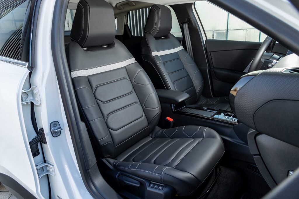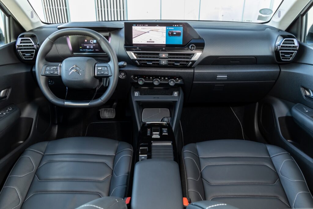 A primeira impressão do interior é de conforto, misturado com alguma tristeza. Se as linhas e o conceito do design exterior são ousadas e interessantes, a inspiração é servida de forma menos vincada no habitáculo. Visualmente, é um interior com muito plástico (a maioria duro) à vista, tornando-o algo frio e até pouco inspirado. A zona central do tablier é o mais interessante, com o ecrã de infotainment inserido de forma original, por cima das saídas de ar centrais, com as saídas de ar lateral a destacarem-se pela forma pouco convencional. Mas a originalidade termina aí, com os controlos de climatização a serem (felizmente) manuais, mas com pouco destaque, oferecendo pouco ao conjunto.