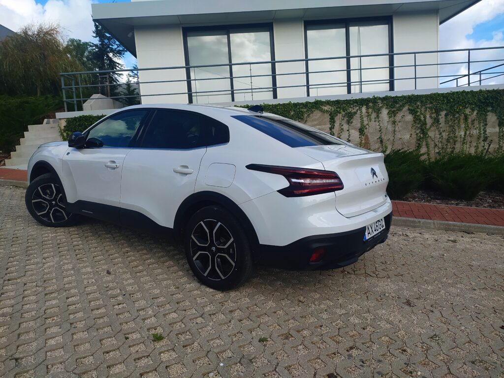 O ë-C4 X, apresenta-se de forma original, com proporções que ficam a roçar no SUV, estando entre uma berlina clássica de 4 portas e os ‘coupés’. Com 4.600 mm de comprimento, preenche o espaço entre os modelos C4 de dois volumes (4.360 mm) e C5 X (4.800 mm) na linha da Citroën, compartilhando uma distância entre eixos de 2,67 m com o C4 de dois volumes. A sua silhueta fastback distinta, combinada com uma saliência traseira habilmente projetada, proporciona uma aparência que se destaca, com uma bagageira de 510 litros. A aerodinâmica otimizada resulta num coeficiente de arrasto de CX 0.29, um pormenor importante neste mundo dos elétricos onde qualquer contributo é importante para aumentar a autonomia, que neste carro é de 360 km em ciclo WLTP.