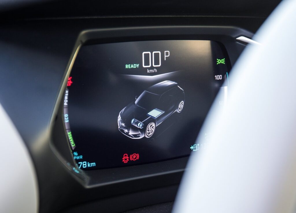 Passar por lombas, buracos ou meras depressões, fazem-se sentir de forma inesperada, principalmente para quem já experimentou o DS3 com motor térmico. Esse é um carro suave e confortável, para o bem e para o mal, claro!, o DS3 E-Tense, está no polo oposto. No que toca á performance, este DS3 elétrico só perde para o mais potente de todos os DS3, equipado com o três cilindros a gasolina 1.2 Puretech com 155 CV: 8,7 segundos dos 0-100 km/h com uma velocidade máxima limitada aos 150 km/h. O carro tem três modos de condução: Eco, Normal e Sport. O primeiro reduz a potência do motor (para 83 CV) e aumenta a autonomia, mas a não ser que esteja mesmo atrapalhado em termos de autonomia do género, faltam 10 km e o indicador de carga diz que só há sumo para mais 5 km. Ai o modo Eco funciona bem. O melhor é o modo normal, já que oferece 110 dos 136 CV disponíveis e permite ritmos mais elevados sem um gasto obsceno da bateria. O modo Sport oferece tudo o que há para oferecer da mecânica elétrica, permitindo a tal aceleração imediata típica dos veículos elétricos e essencial para ultrapassagens mais justas. Mas lembre-se sempre que há ali 300 kgs que cobram a fatura nestas alturas. Dizer que os diversos modos influem na direção, tornando-a mais ou menos pesada, sendo que é rápida e direta. O DS3 E-Tense tem um calcanhar de Aquiles na travagem. Não há problemas em imobilizar o carro – embora tenhamos sempre aquela sensação que a força no pedal é pouca e não vamos parar e quando carregamos mais, acabamos a bater com a cabeça no vidro – mas o pedal é realmente muito inconsistente. O DS3 E-Tense tem um modo B de regeneração mais forte da energia de travagem e desaceleração, mas muito mais benigna que, por exemplo, num BMW i3 ou no Nissan Leaf com e-Pedal. A curvar é eficaz, embora os 300 kgs a mais se sintam em alguma inrcia, nada que as suspensões duras não resolvam.
