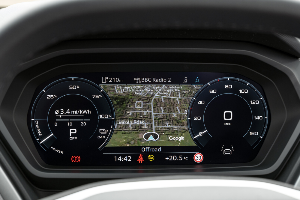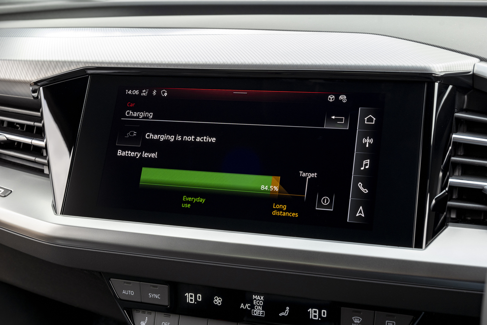 O pacote de infoentretenimento neste SUV eestá estruturado em três níveis – MMI, MMI plus (a usada neste ensaio) e MMI pro. Diferentes funções são fornecidas, dependendo do nível de configuração, incluindo o head-up display de realidade aumentada e o Audi virtual cockpit plus. Os níveis opcionais (MMI plus e MMI pro) fornecem os serviços online do Audi connect, incluindo o planeamento inteligente de rotas e-tron, para calcular a rota ideal que fica mais perto de um posto de carregamento público.