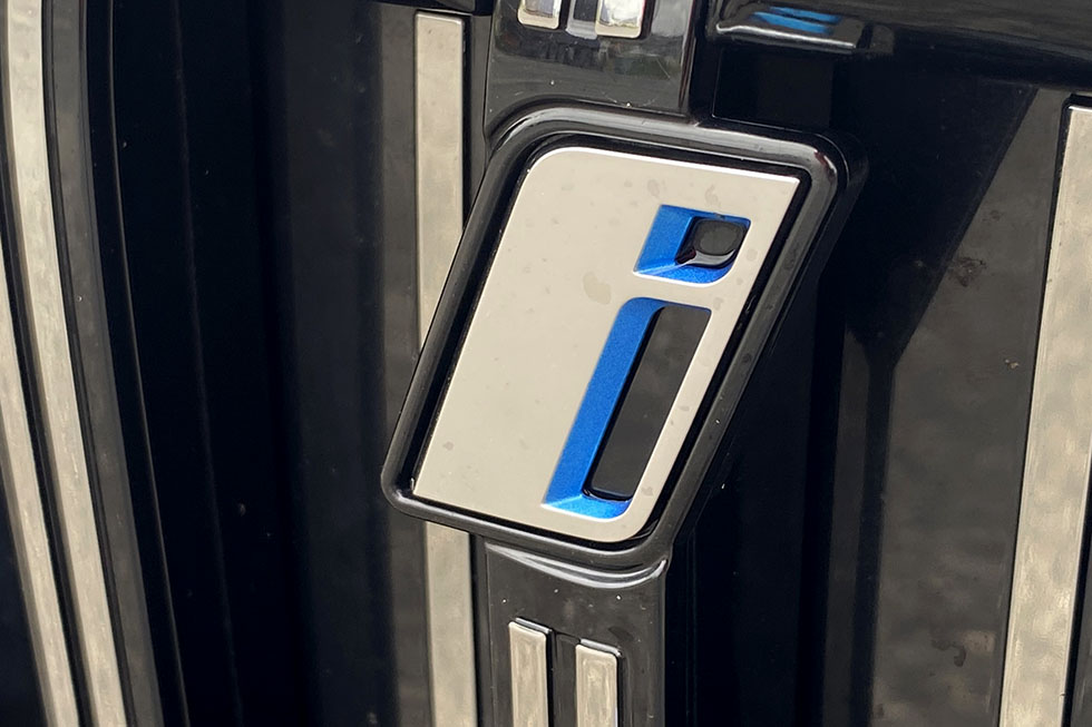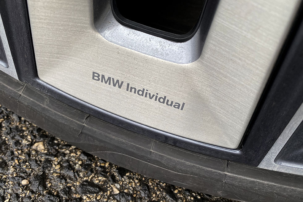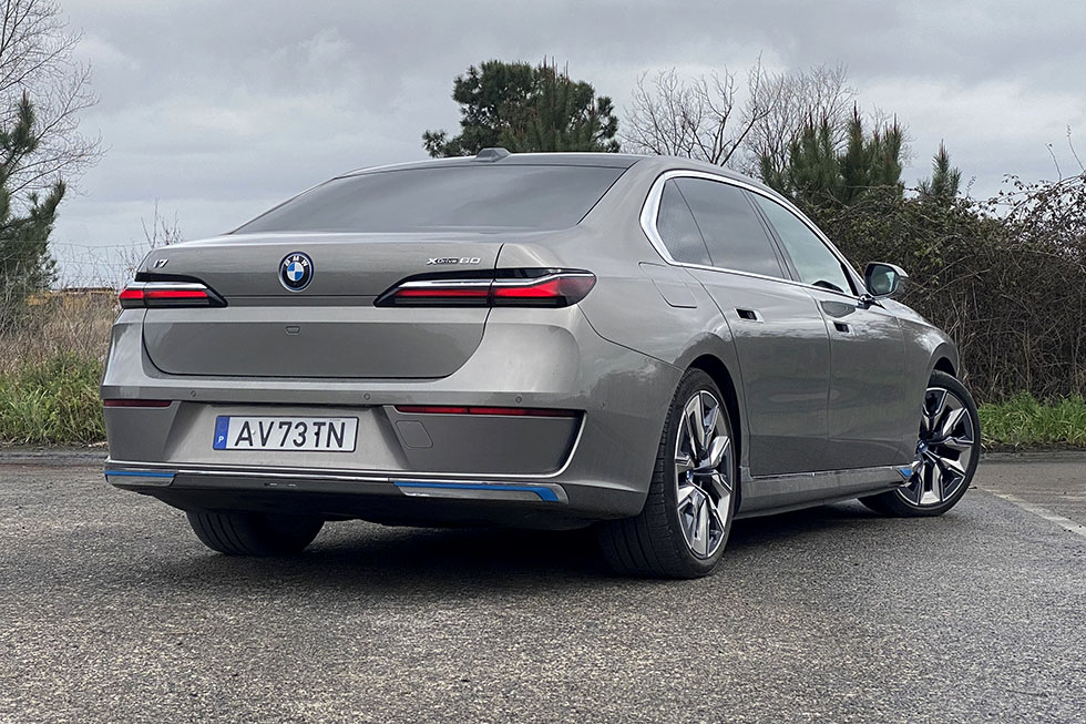 As jantes de 21 polegadas, assinadas pela BMW Individual, chegam a parecer pequenas neste conjunto e quando olhamos de perfil para o i7 percebemos que o maior destaque está mesmo para quem viaja na fila de assentos traseira, que conta com uma porta bem maior do que a da frente. Por se tratar de uma versão “i”, há diversos elementos em azul, tais como as molduras do logo da marca e outros detalhes um pouco por toda a carroçaria, mas se assistir às portas a abrirem automaticamente quando se aproxima do carro, nem vai reparar nos detalhes em azul.