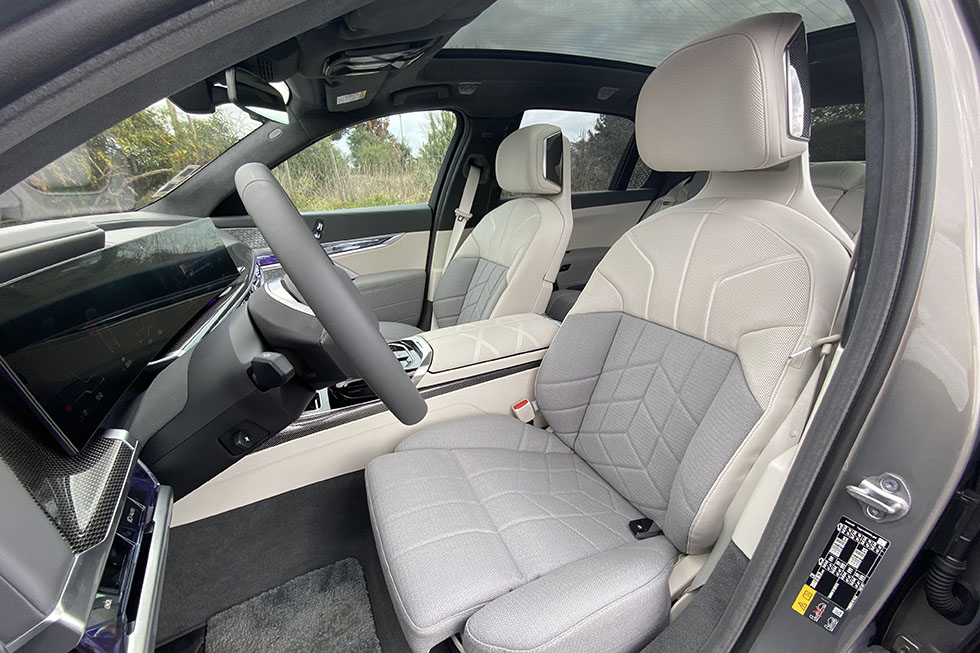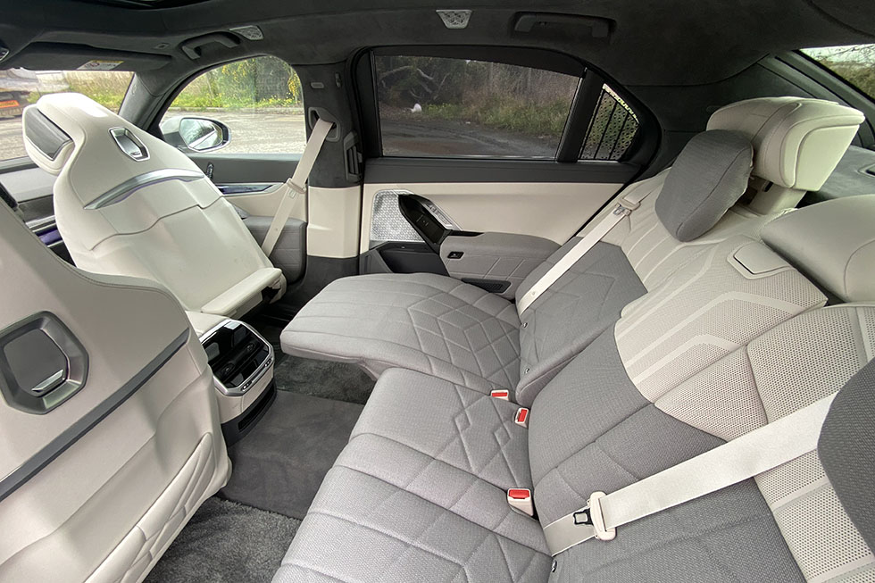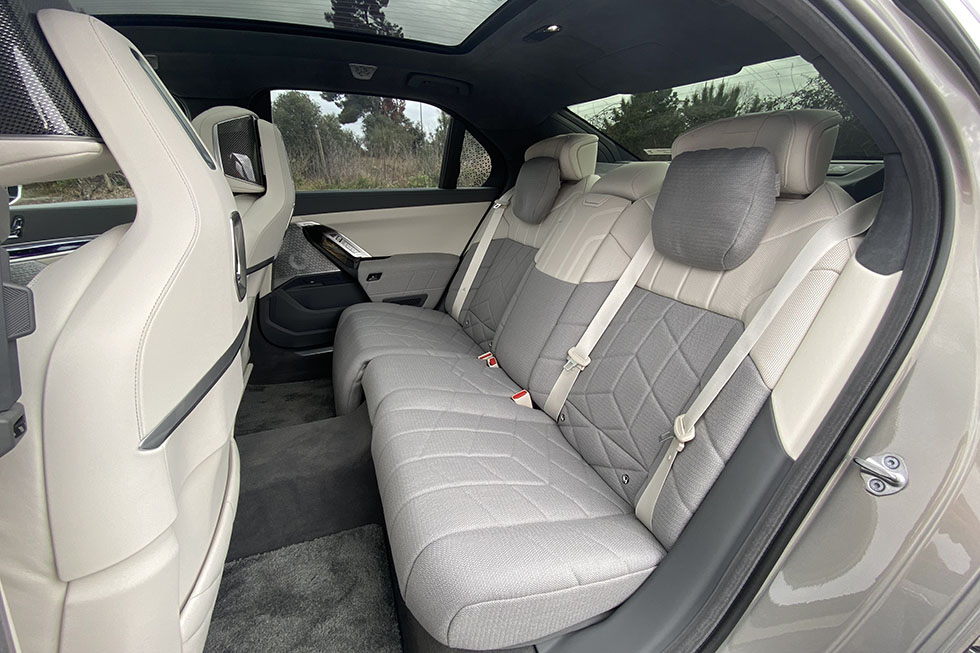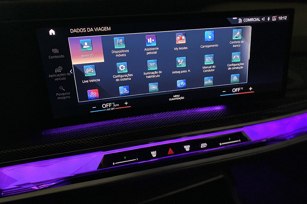 No assento do passageiro traseiro do lado direito, disponível como opção mas presente na unidade ensaiada, estava o banco Executive Lounge, que se pode transformar numa chaise-longue, empurrando o assento dianteiro do passageiro para a frente e rebatendo parcialmente as suas costas. Aliado a um sistema de aquecimento ou refrigeração e a diversos programas de massagens disponíveis, o habitáculo do i7 passa mesmo a ser um espaço do qual não queremos sair. Vai sempre haver um novo detalhe por descobrir ou uma peça mais original que nos mostra o elevado patamar de atenção ao detalhe e escolha de materiais que a BMW dedicou a esta nova geração do seu topo-de-gama.