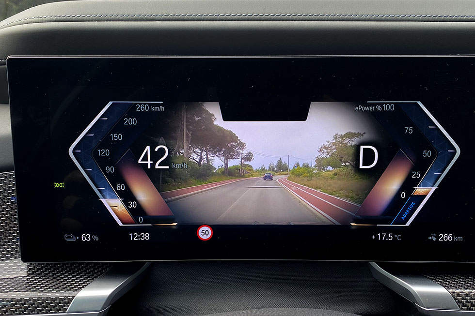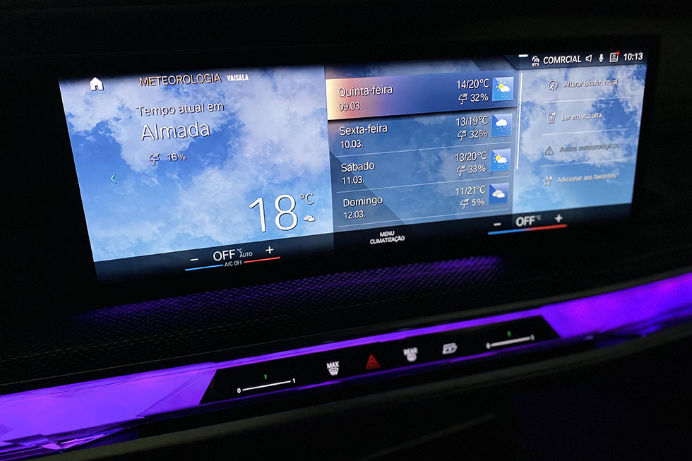Ainda que o peso seja uma condicionante, o motor mais potente é o que está instalado no eixo posterior, uma vez que, apesar de se tratar de um modelo focado essencialmente no luxo e no conforto, não foi descurada a possibilidade de quem vai ao volante querer apreciar cada momento de condução. No início foi uma ideia que não ponderámos, pois está longe de ser esse o objetivo do i7. Porém, na passagem por uma conhecida estrada secundária e com menos trânsito que o habitual, começámos a perceber que a dinâmica deste enorme automóvel é bastante apurada e que no modo Sport, a banda sonora composta por Hans Zimmer tem a capacidade de tornar tudo ainda mais interessante.