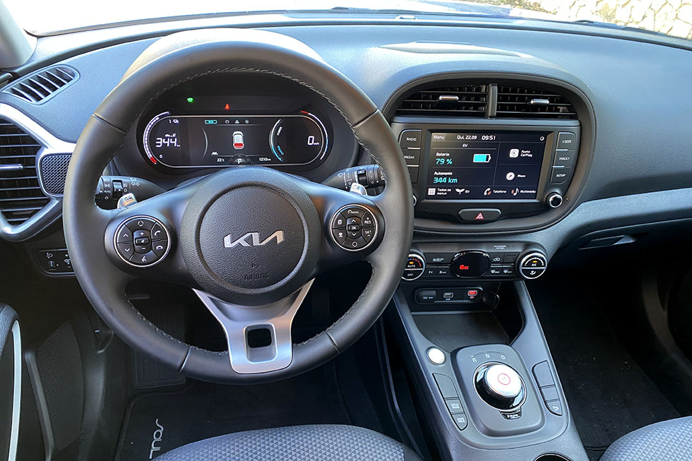 Ainda assim, e apesar de não ser essa a sua filosofia, o facto de os mais de 450 quilos que pesa a bateria estarem instalados debaixo do piso e das vias do e-Soul até serem generosas, faz com que este modelo tenha um desempenho engraçado em curva, sendo apenas ter algum cuidado com a aderência dos pneus, que são de baixo atrito e não toleram grandes abusos. Seja como for, os 204 cavalos do motor têm sempre autorização para galoparem um pouco, sempre que quiserem. Do lado mais prático, o e-Soul inclui o comando rotativo da caixa de velocidades que já conhecemos de outros modelos da Kia e também as patilhas atrás do volante através das quais podemos definir o patamar de regeneração do sistema, ou mesmo ativar o modo automático deste, deixando-o gerir a quantidade de energia captada da melhor forma. E para finalizar, o sistema de infotainment tem uma função muito original: lembra-se daqueles momentos numa viagem em que os miúdos finalmente adormecem lá atrás, mas continua a gostar de ouvir as suas playlists preferidas? No e-Soul basta ativar o ‘modo silencioso’ nesses momentos. O som fica apenas dos assentos dianteiros e todos os níveis de volume existentes passam para um patamar mais tranquilo.