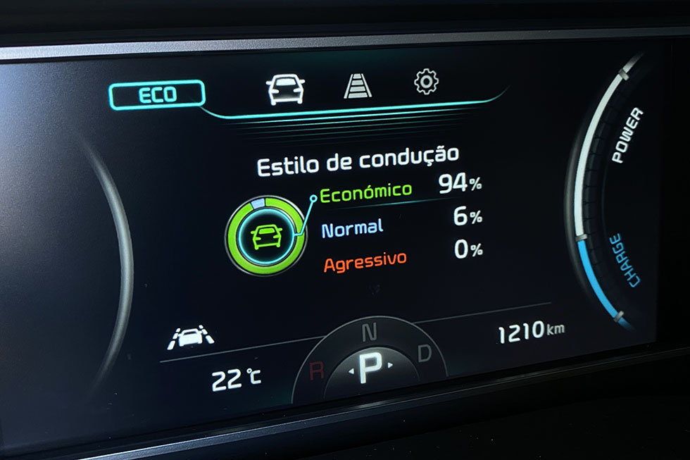 Com os 457 quilos da bateria já adicionados, o valor total do Kia e-Soul começa nos 1.682 quilos, o que poderá parecer pouco para os 204 cavalos disponíveis. No entanto, com um pouco de cuidado e seguindo o gráfico que o sistema nos vai mostrando, os valores de consumo deste modelo conseguem ser surpreendentes. A marca apresenta um valor de 15,7 kWh para um percurso misto e nós chegámos ao final do ensaio com 16,1, que não é muito diferente. Mas com um pouco mais de cidade à mistura e algum cuidado, chegámos a circular com o computador de bordo pouco acima dos 14 kWh/100km, o que traduz a eficiência do sistema. Não sabemos se conseguirá alcançar os 648 quilómetros de autonomia máxima que a marca declara (em ambiente urbano), mas é mais do que garantido que supera os 452 quilómetros indicados para um percurso misto.