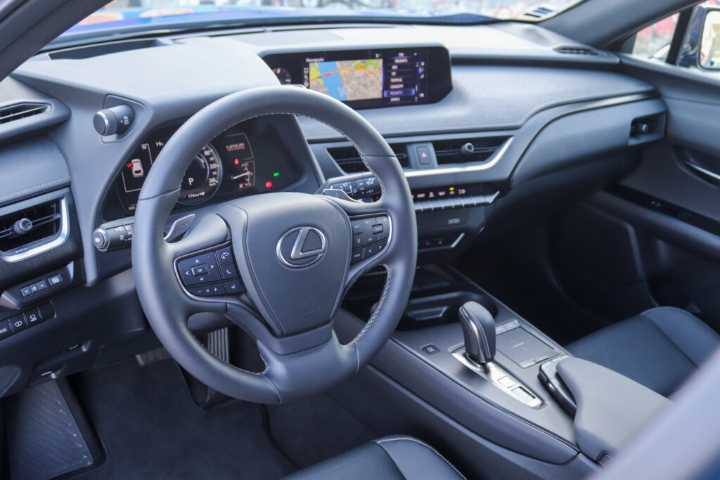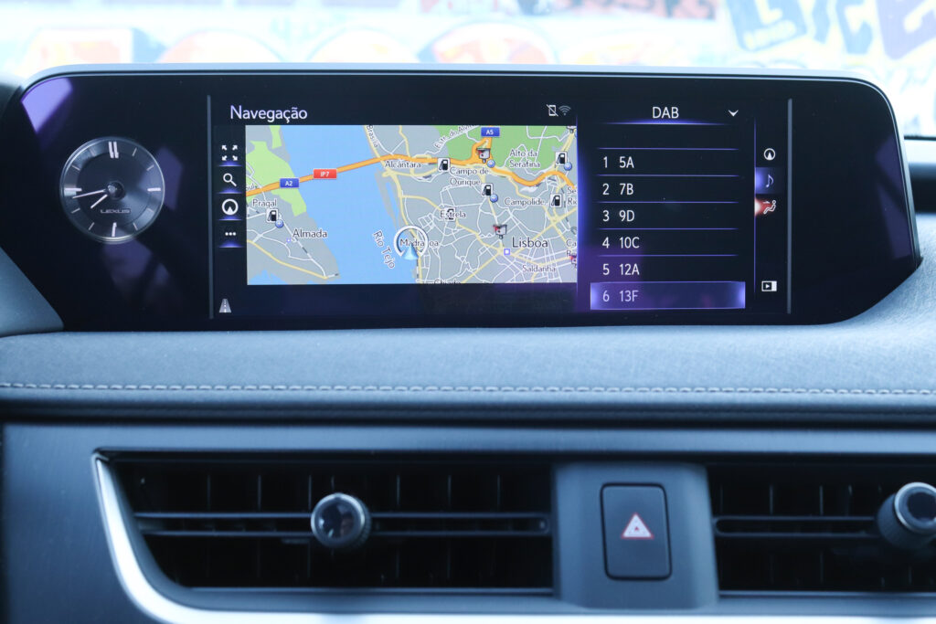 Interior (7/10) Ao abrir a porta entramos, sem qualquer sombra de dúvidas, num habitáculo da Lexus. Com uma qualidade de construção e de materiais referenciais, sentimo-nos, efetivamente, num interior premium. O condutor tem à sua frente um painel de instrumentos que conjuga o analógico com o digital. O ecrã central, incorporado no tablier, transmite as informações do sistema de infotainment da marca que apresenta um visual não tão moderno e intuitivo como o dos rivais. Apesar de encontrarmos um touchpad na consola central, a sua utilização é algo complexa.