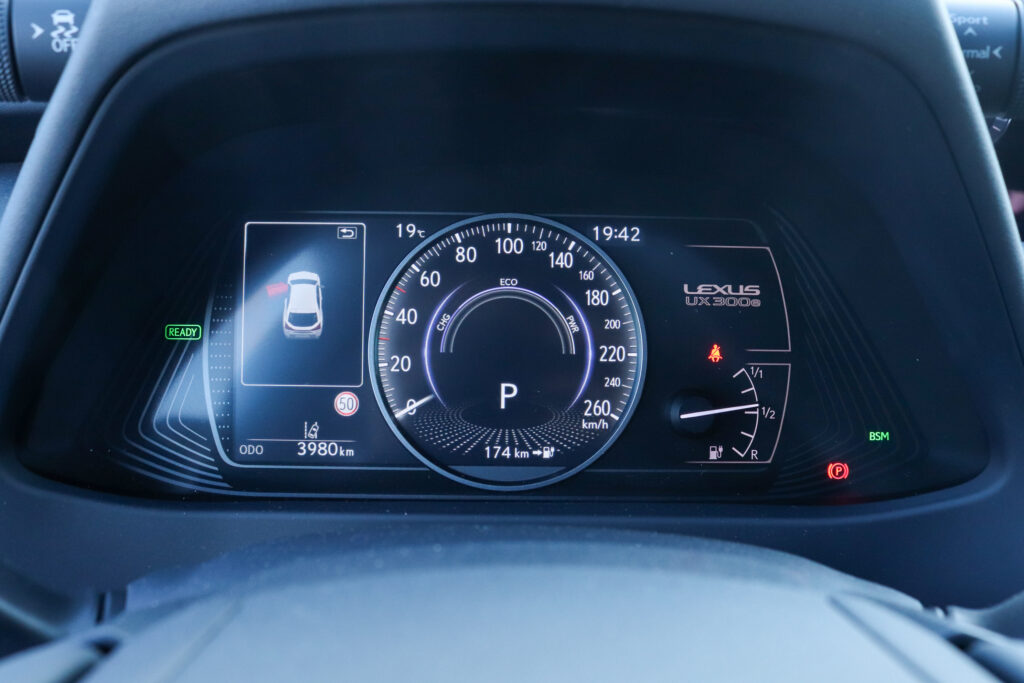 Em cidade, com a ajuda dos quatro níveis de intensidade da travagem regenerativa, controlados pelas patilhas no volante, é possível fazer uma condução quase só com o pedal do acelerador. De referir ainda que este sistema é um dos mais suaves do mercado de carros elétricos e, assim, não se perde demasiado ímpeto ao tirar o pé do acelerador. Neste ponto a Lexus beneficiou dos conhecimentos pré-adquiridos com os híbridos. Numa utilização mais dinâmica os mais 280 kg de peso comparativamente com a variante híbrida fazem-se sentir, contudo, o centro de gravidade mais baixo ajuda a atenuar o adornar de carroçaria.