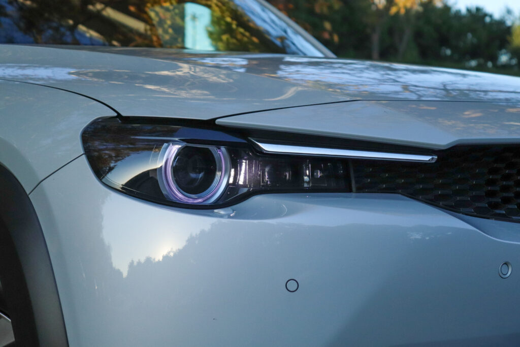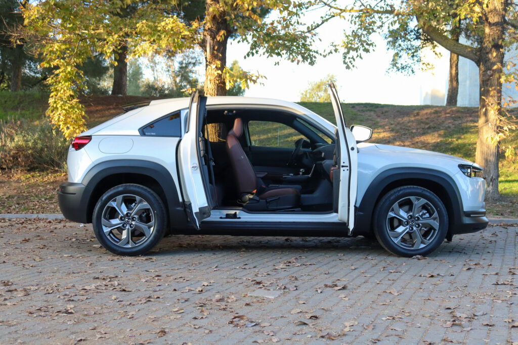 Exterior (8/10) O Mazda MX-30 é um modelo que, mesmo depois de estar no mercado há sensivelmente um ano, continua a virar cabeças. De facto, a marca nipónica dotou o elétrico de um design que combina características reconhecidas da marca, a robustez e elegância. Mesmo nesta versão Advantage, o MX-30 está disponível com uma assinatura de luz em LED e jantes de 18 polegadas. As portas de trás de abertura invertida são diferentes e irreverentes, contudo, mostraram-nos que o seu mecanismo de abertura não é o mais prático, principalmente em espaços apertados.
