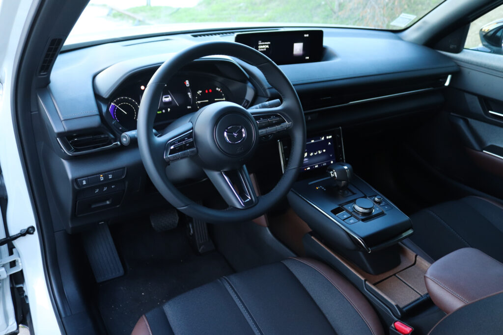 Ao volante (8/10) Apesar de ser elétrico, o MX-30 tem “ADN Mazda” no que diz respeito à condução. De facto, é um SUV que nos transmite boas sensações ao volante, mostrando-nos que um carro elétrico não precisa de ser somente um meio de transporte para ir do ponto A ao ponto B. Destaque para uma direção bem calibrada, posição de condução típica dos SUV e uma suspensão bem trabalhada. Esta última filtra da melhor forma as saliências da estrada mas, por outro lado, ajuda a ter uma condução ágil e segura. De um modo geral, a condução do Mazda MX-30 é um dos seus pontos mais fortes.