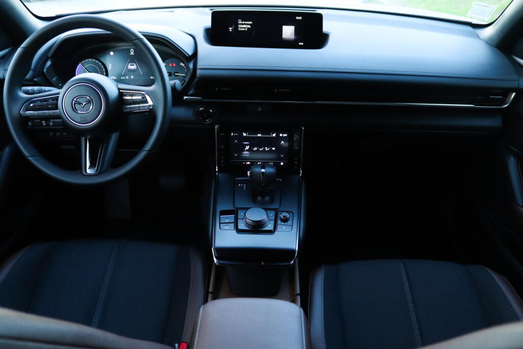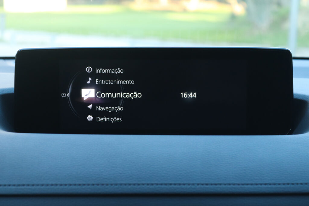Por outro lado, a qualidade de construção e materiais utilizados estão em linha com a qualidade reconhecida da Mazda, ou seja, é difícil encontrar defeitos. De mencionar que, nesta versão Advantage, os detalhes em cortiça dão uma personalização positiva. Tudo isto é acompanhado por um ecrã central instalado na parte superior do tablier, onde são transmitidas as informações do sistema de infotainment, sistema esse que pode ser comandado através de um comando rotativo instalado na consola central.