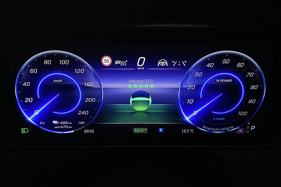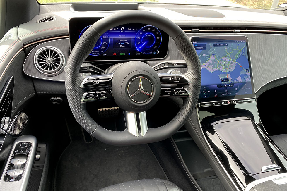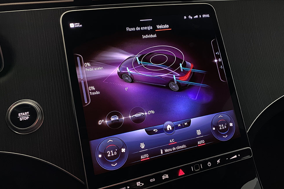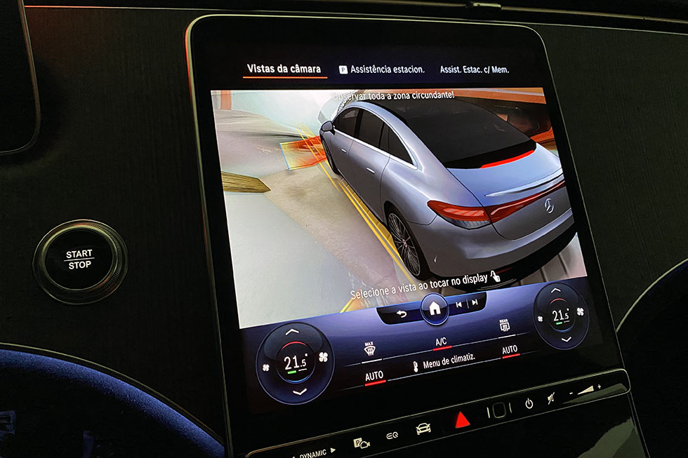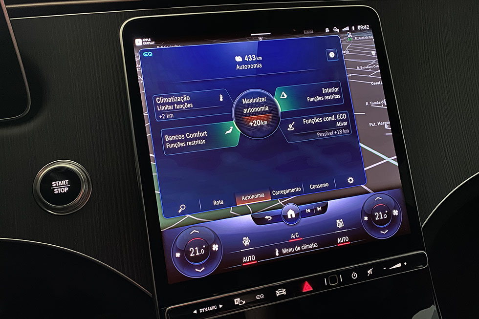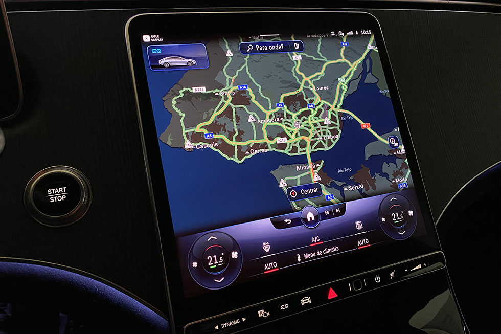 Na unidade ensaiada, predominam os tons mais escuros, que, apesar de tudo contam com uma boa iluminação, fornecida pela presença do teto de abrir panorâmico. E a qualidade de acabamentos e de materiais não fica muito afastada do que encontrámos no EQS. Menos positivo, é a capacidade da bagageira, que se viu limitada a 430 litros e alguns dos comandos táteis com os quais não conseguimos simpatizar e que requerem bastante habituação.
