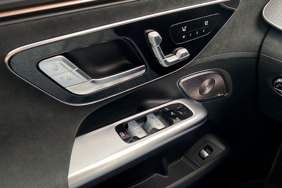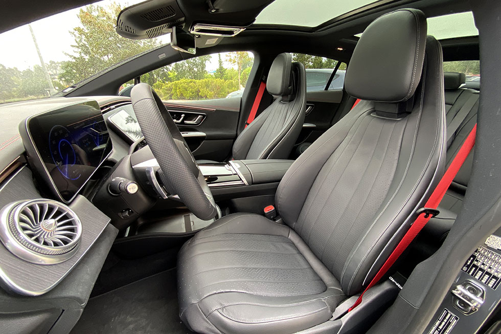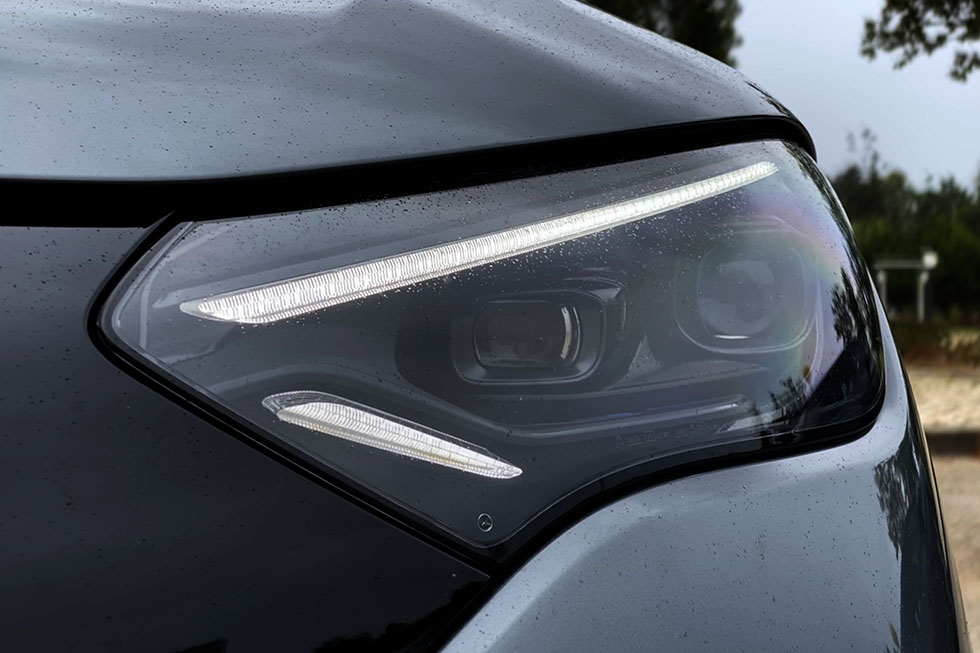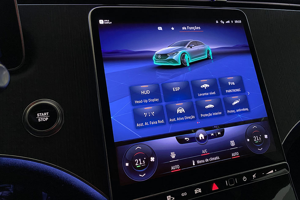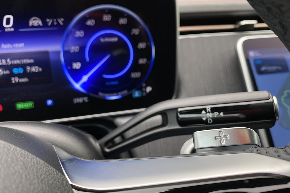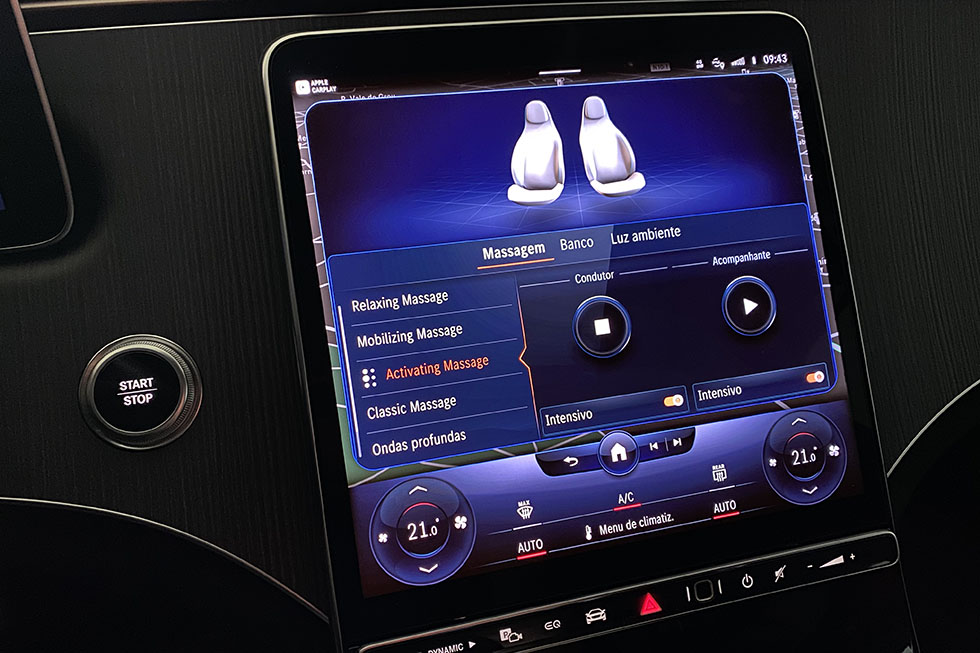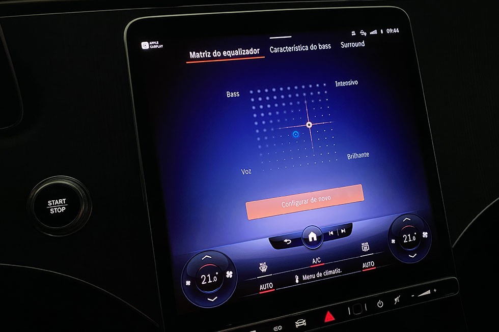 Na unidade ensaiada, predominam os tons mais escuros, que, apesar de tudo contam com uma boa iluminação, fornecida pela presença do teto de abrir panorâmico. E a qualidade de acabamentos e de materiais não fica muito afastada do que encontrámos no EQS. Menos positivo, é a capacidade da bagageira, que se viu limitada a 430 litros e alguns dos comandos táteis com os quais não conseguimos simpatizar e que requerem bastante habituação.