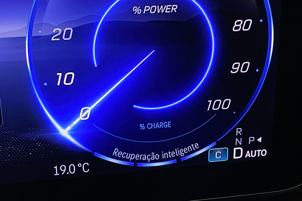 Iniciar a condução com um valor próximo dos 600 quilómetros elimina quase por completo a ansiedade da autonomia. Mais ainda quando começamos a perceber que o EQE consegue aproveitar cada metro para ir tentando regenerar energia para a bateria do sistema, especialmente quando está selecionado o modo de regeneração automático, que mede a distância para o carro da frente e ajusta a regeneração em função disso, chegando mesmo a parar o carro, sem que sejamos nós a carregar no pedal do travão. A velocidades, muito reduzidas, claro.