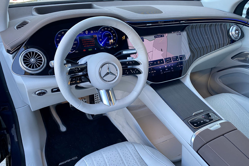 Em estrada e autoestrada, o deslizar do EQS está num patamar quase perfeito. A suspensão pneumática deixa o habitáculo praticamente a flutuar, enquanto ignora a maioria das irregularidades do piso que possam surgir, ainda que a sua afinação seja um pouco mais firme do que no EQS normal, de forma a controlar melhor os movimentos de uma carroçaria muito mais alta e também por estar presente um conjunto de jantes da AMG, mais aerodinâmicas, e com 21 polegadas de diâmetro. O que é que isso prejudica o conforto? Nada. A bordo, o ambiente continua perfeitamente distante de tudo o que se passa lá fora, nesta “nossa” assoalhada privada e móvel.