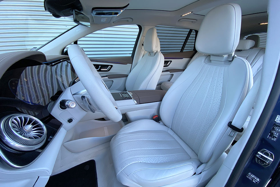 Depois dos puxadores das portas se destacarem da carroçaria assim que nos aproximamos, acedemos a um habitáculo que está praticamente no patamar mais elevado de todos os modelos produzidos pela Mercedes. E só dizemos praticamente por na mesma marca existe um tal de Classe S. Os tons mais claros escolhidos para o habitáculo da unidade ensaiada oferecem uma luminosidade fantástica a bordo, que ainda é melhorada pelo teto panorâmico. E depois, a presença dos sete lugares (a terceira fila é uma opção), também nos deixa com vontade de juntarmos algumas pessoas a bordo e partilhar o patamar de silêncio em que o EQS nos deixa, mesmo quando estamos em movimento.