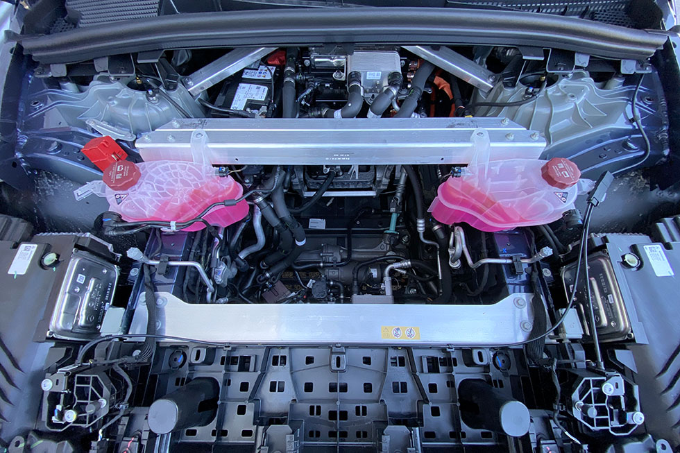 Apenas com cinco assentos em utilização, a capacidade da bagageira da versão de sete lugares conta com uns amplos 565 litros de capacidade, mas se os sete lugares estiverem em utilização, este valor passa para baixo dos 200. E neste momento, ficamos a pensar porque é que o espaço debaixo do capot não é aproveitado de uma forma mais útil. É que, sem um motor térmico, há um enorme espaço vazio disponível, que podia ser bastante útil quando há sete pessoas a viajar no habitáculo.
