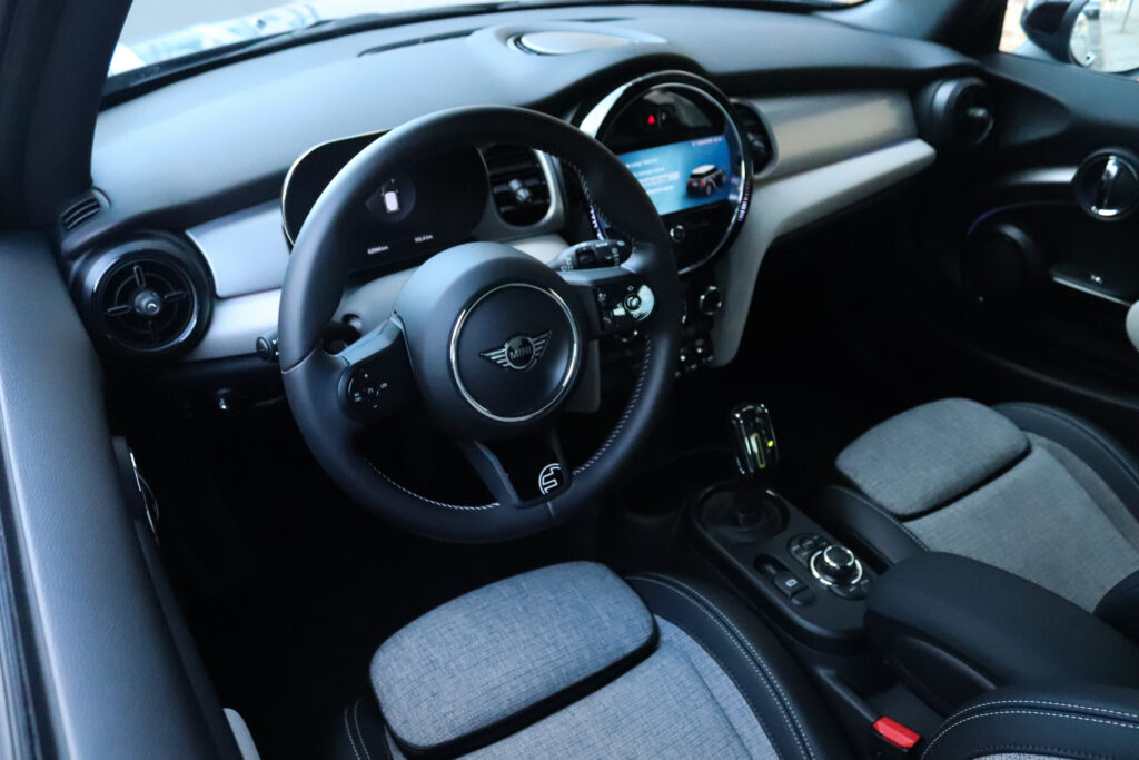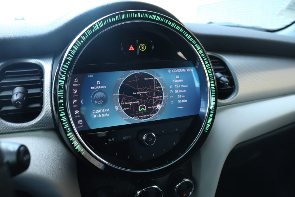 Exterior (8/10) A frase “em equipa que ganha, não se mexe” assenta que nem uma luva na filosofia de design da Mini. Com as linhas bem reconhecidas da marca britânica do Grupo BMW, esta atualização muda em pequenos detalhes com especial destaque para a secção dianteira que apresenta uma grelha ampliada com moldura em preto. O para-choques conta ainda com novas entradas de ar nas laterais, ao mesmo tempo que os faróis redondos continuam presentes. Uma das inovações desta atualização é o acabamento especial do tejadilho com uma espécie de “degradê” de cores. Esta versão elétrica diferencia-se das restantes através da inclusão da letra S em amarelo e o logo Mini Electric.