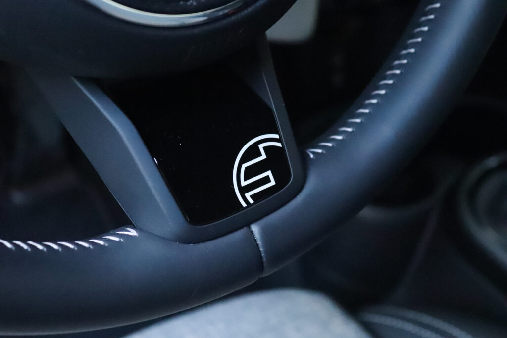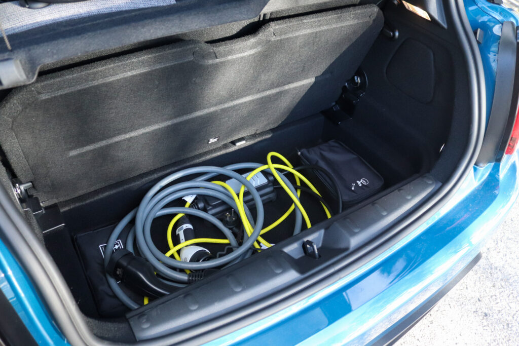 Interior (7/10) Assim que entramos no habitáculo rapidamente percebemos que versão estamos a conduzir. O volante apresenta o logo específico da versão, ao mesmo tempo que o manípulo do seletor de velocidades conta com detalhes em amarelo. Tal como já é reconhecido das versões de três portas, o espaço a bordo não é o melhor, principalmente na segunda fila de bancos. O acesso é algo complexo e os passageiros traseiros contam com pouco espaço para pernas. De referir que a versão elétrica apresenta uma volumetria de bagageira igual às versões a combustão, ou seja, 211 litros.