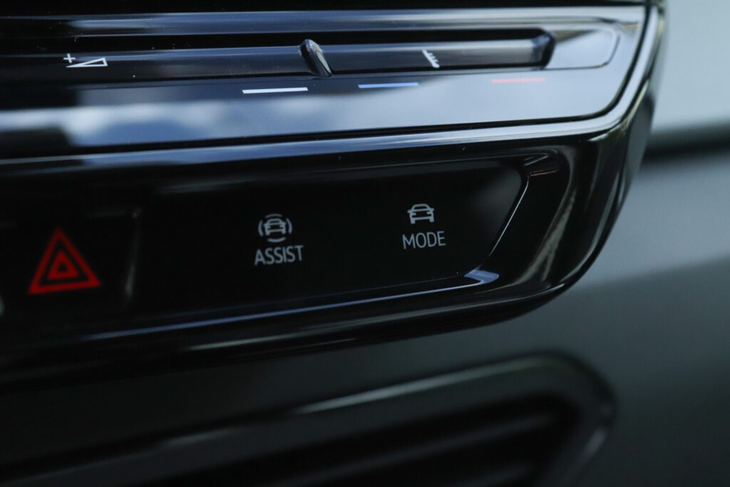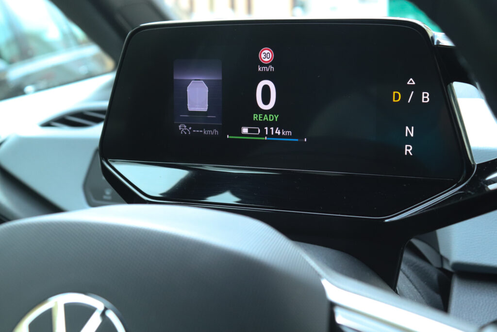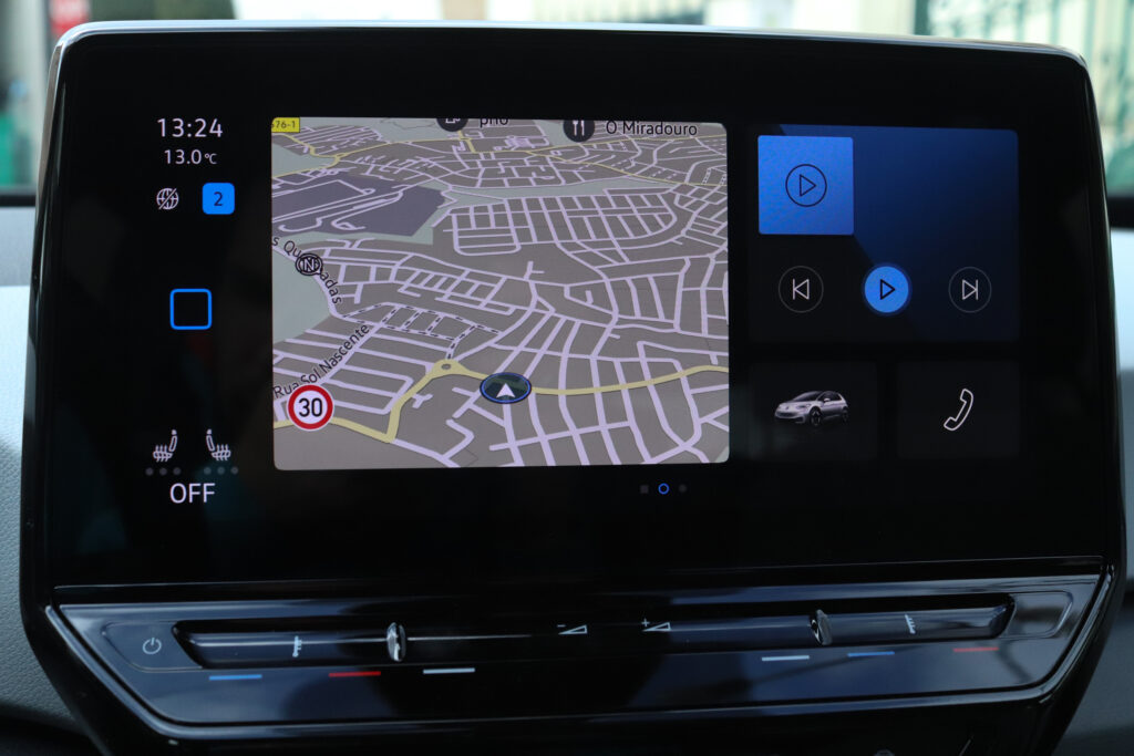 Interior (7/10) No interior, a Volkswagen também não poupou esforços e criou um habitáculo completamente distinto. Com um desenho futurista e minimalista, o condutor é acompanhado por um painel de instrumentos digital de cinco polegadas. Este tem um manípulo giratório que comanda a caixa de velocidades, um pouco como acontece, por exemplo, no BMW i3. Ao centro do tablier surge um ecrã tátil de 10 polegadas que transmite as informações do sistema de infotainment. É aqui que se concentra grande parte dos controlos do veículo desde climatização até à conectividade. Como seria de esperar num veículo focado no modernismo, os sistemas Android Auto e Apple CarPlay estão presentes. Porém, a quase ausência de botões físicos em detrimento de soluções digitais requerem alguma habituação, como é o caso da utilização do mesmo comando para abrir ou fechar os vidros dianteiros e traseiros.