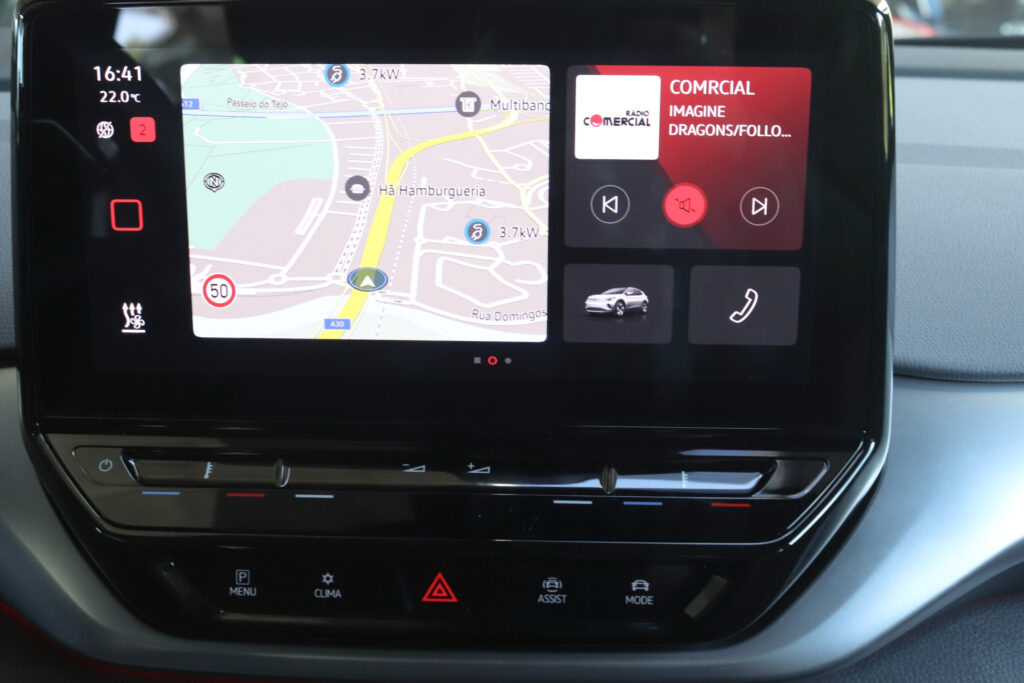 Ao volante (7/10) Ao entrarmos para o lugar do condutor, rapidamente percebemos que estamos num verdadeiro SUV com a posição de condução alta a conferir uma boa visibilidade para a estrada. Apesar de ser um SUV de cariz familiar, a Volkswagen adotou uma afinação de suspensão firme que, para os mais sensíveis, pode até ser em demasia, principalmente ao passar em ruas mais degradadas. Por outro lado, confere uma dinâmica satisfatória para um SUV com mais de duas toneladas, mas longe de ser um desportivo. Nesse ponto, temos de esperar pelo GTX, a nova sigla dedicada a carros elétricos de performance. Quando saímos do ambiente citadino, o ID.4 tem autonomia suficiente para fazer viagens com distâncias consideráveis. Em autoestrada, mantém a velocidade máxima permitida sem grandes dificuldades e, no que diz respeito a insonorização, denotamos um ligeiro ruído de rolamento muito por culpa dos enormes pneus 235/50 R20 à frente e 255/45 R20 atrás.