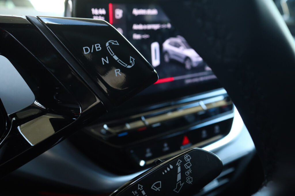 Interior (8/10) Passando para o interior, também aqui o design é semelhante ao ID.3, ou seja, o condutor tem à sua frente um painel de instrumentos digital de 5,3 polegadas com o manípulo de seleção de velocidade e, ao centro, um ecrã tátil onde são transmitidas as informações do mais recente sistema de infotainment da marca. A construção aparenta ser boa, mas de referir a utilização de plásticos duros ao toque, algo comum na marca alemã.