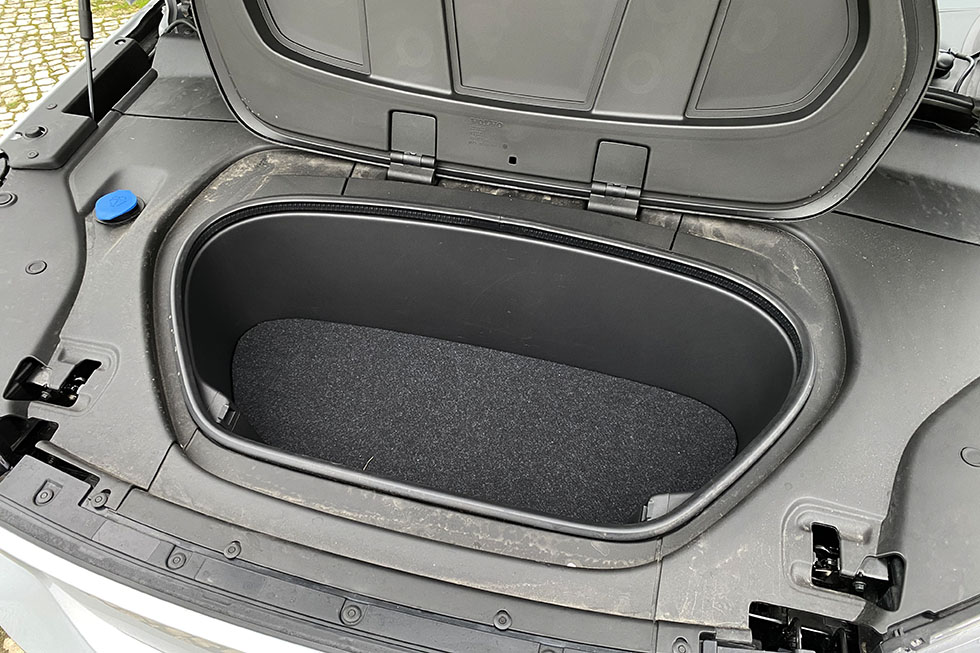 Uma vez que se trata da versão 100% elétrica deste modelo, a maior diferença exterior está mesmo na frente. O local onde normalmente está uma grelha frontal é agora um painel pintado na mesma cor da carroçaria. E debaixo do capot, em vez de um enorme motor, está um espaço de arrumação destinado a coisas menos volumosas, como os cabos destinados ao carregamento do sistema elétrico, por exemplo.