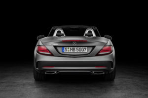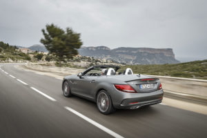 Como as dimensões não foram alteradas, o SLC continua mais compacto do que um Audi TT ou BMW Z4, modelos que, pelo seu perfil e preço, se posicionam como os seus mais diretos concorrentes. Para convencer os clientes a apostar nele em detrimento dos rivais, fornece como opcional um pacote de condução dinâmica, influenciando molas, amortecedores e barras estabilizadoras e rebaixando, neste caso, a suspensão em 10 mm. Com isso permite que se selecione o modo Sport e Sport+ no Dynamic Select (Comfort, Eco e Individual, os restantes). É nos dois primeiros que o SLC se torna mais assertivo, cabendo ao Comfort os passeios tranquilos com a namorada. Mas mesmo no acerto mais ‘duro’, chamemos-lhe assim, o SLC aparenta sempre ser mais gentil do que os rivais, propiciando uma condução suave e instigando quem se encontra ao volante a adoptar essa postura sempre que inicia mais uma viagem.