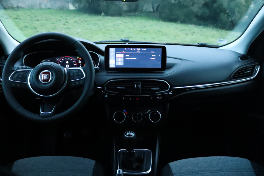 Interior (7/10) No interior, o Fiat Tipo está substancialmente diferente do antecessor, principalmente no capítulo da tecnologia. Neste ponto, o Tipo Cross destaca-se pela inclusão de um novo painel de instrumentos parcialmente digital, acompanhado por ecrã central de 10 polegadas onde são transmitidas as informações do mais recente sistema de infotainment, Uconnect 5, da marca, semelhante ao já conhecido do novo Fiat 500. A melhoria é bastante significativa, não só ao nível de grafismo, mas também na utilização.