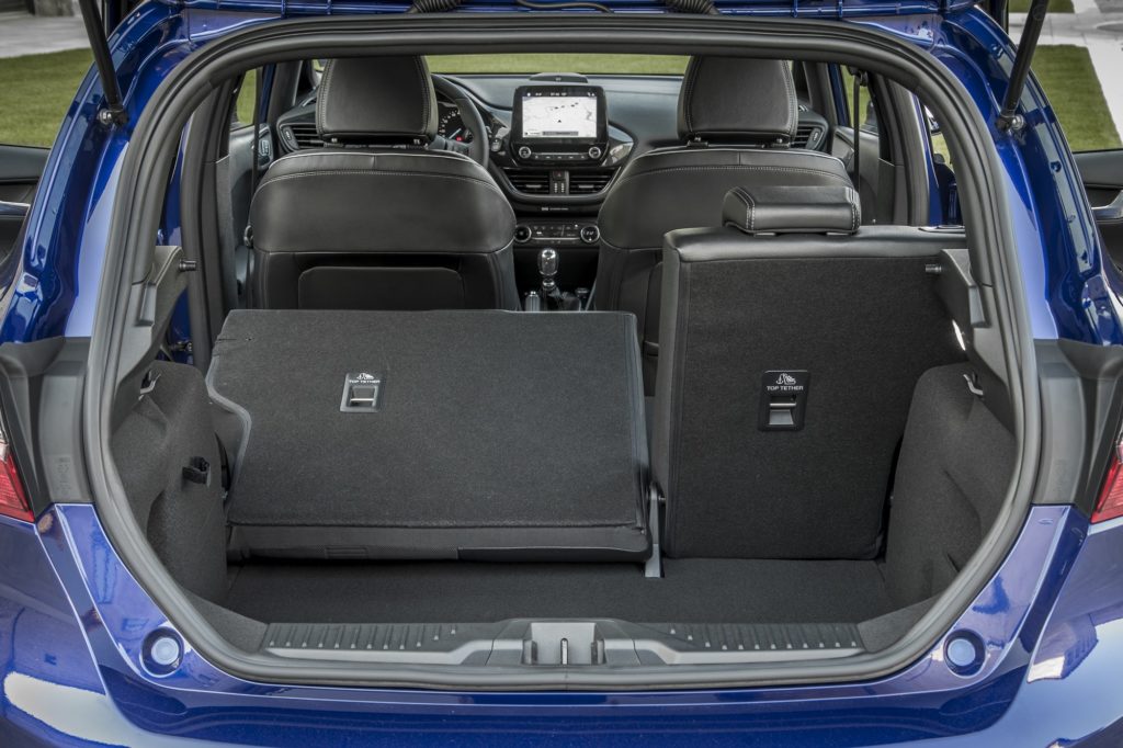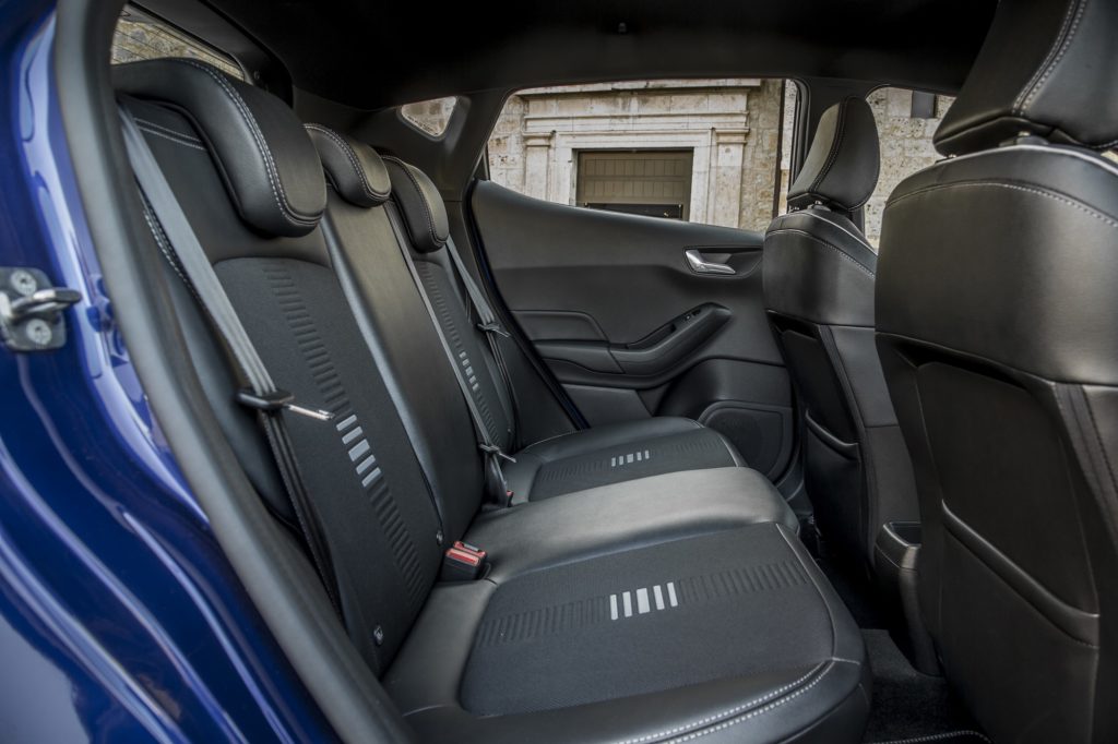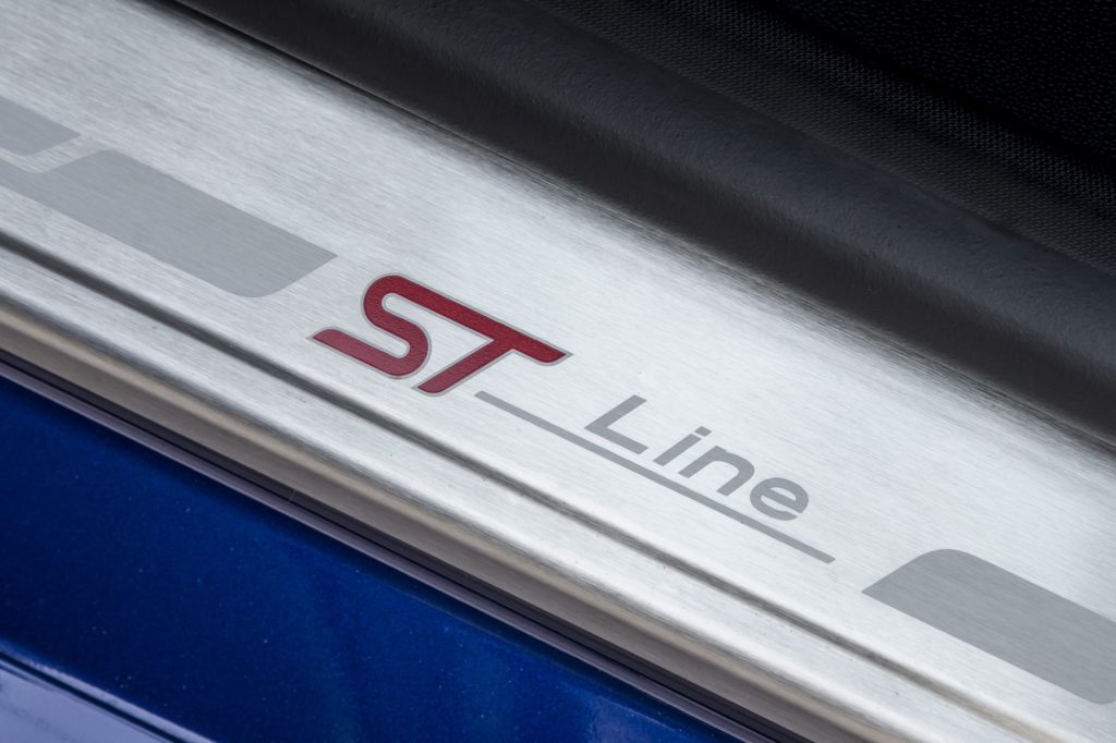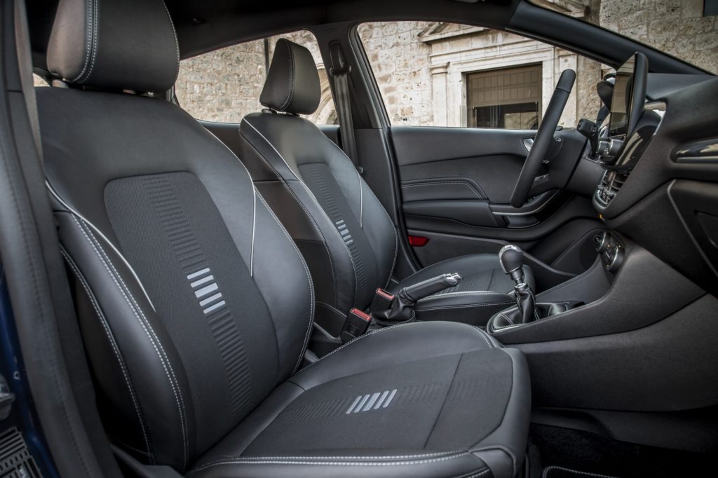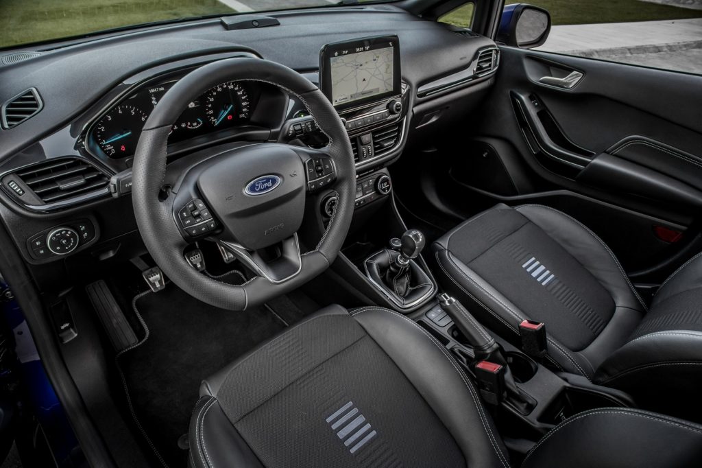 Não é preciso grande esforço para perceber que a personalidade desportiva deste Fiesta também transitou para o habitáculo. O punho da alavanca das mudanças, o volante (com fundo plano) e travão de mão forrados em pele são exclusivos do ST-Line, mas os pedais desportivos em alumínio e os bancos dianteiros em estilo desportivo, com tecido Ebony com pospontos de acordo com a cor da carroçaria e apoio lombar ajustável tornam tudo ainda mais “racing”. Para que não haja qualquer “crise de identidade”, a soleiras das portas prateadas com a inscrição “ST Line” são outros dos pormenores que fazem a diferença na “desportividade”.