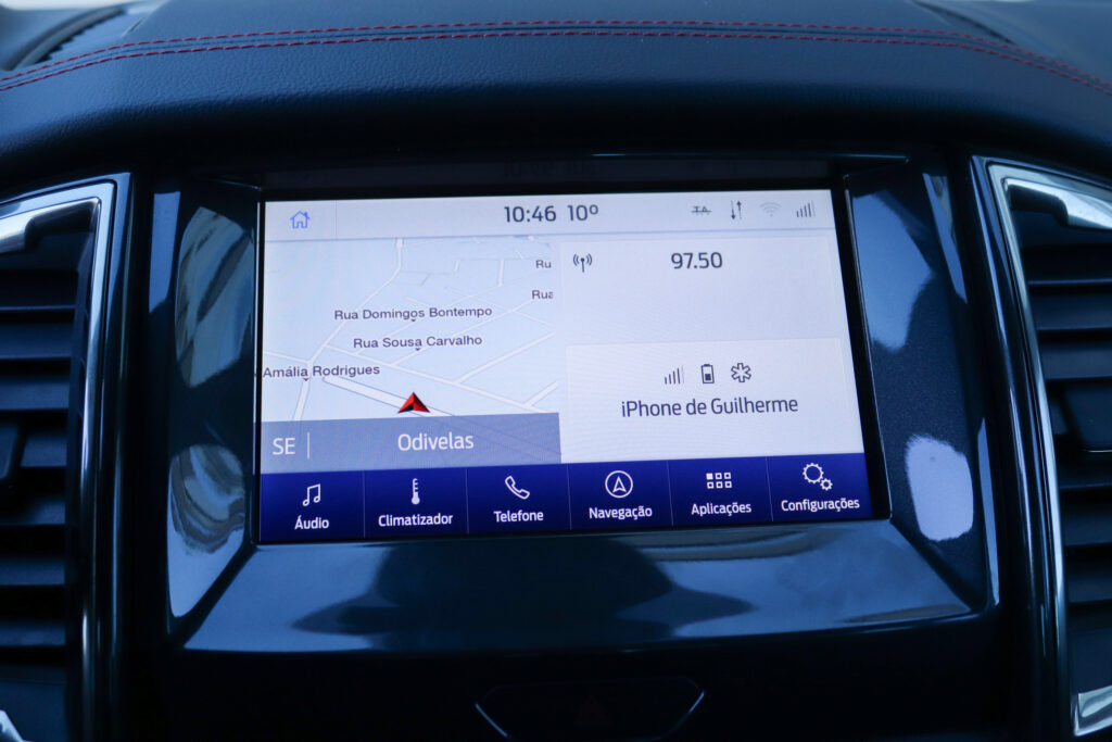 Equipamento (9/10) A Ford Ranger Wildtrak Thunder conta com um recheio de equipamento muito interessante. Na lista de série encontramos as jantes de 18 polegadas, faróis Xenon com luzes dirunas em LED, grelha específica, proteção da caixa de carga, pack off-road, sensor de chuva, vidros escurecidos, ar condicionado bizona, sistema keyless, bancos dianteiros elétricos e aquecidos, sistema de infotainment SYNC3, roda suplente de 18 polegadas, tapetes específicos da versão, volante forrado em pele, câmara de visão traseira, sensores de estacionamento dianteiro e traseiro, entre outros. A unidade em ensaio conta ainda com alguns opcionais: pintura metalizada (508€), pack drive plus + estacionamento assistido (559€) e pack Wildtrak Thunder (2379€).