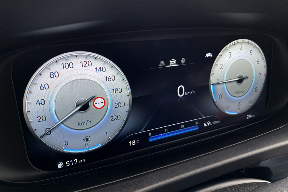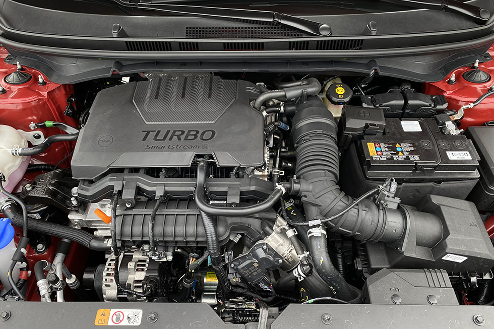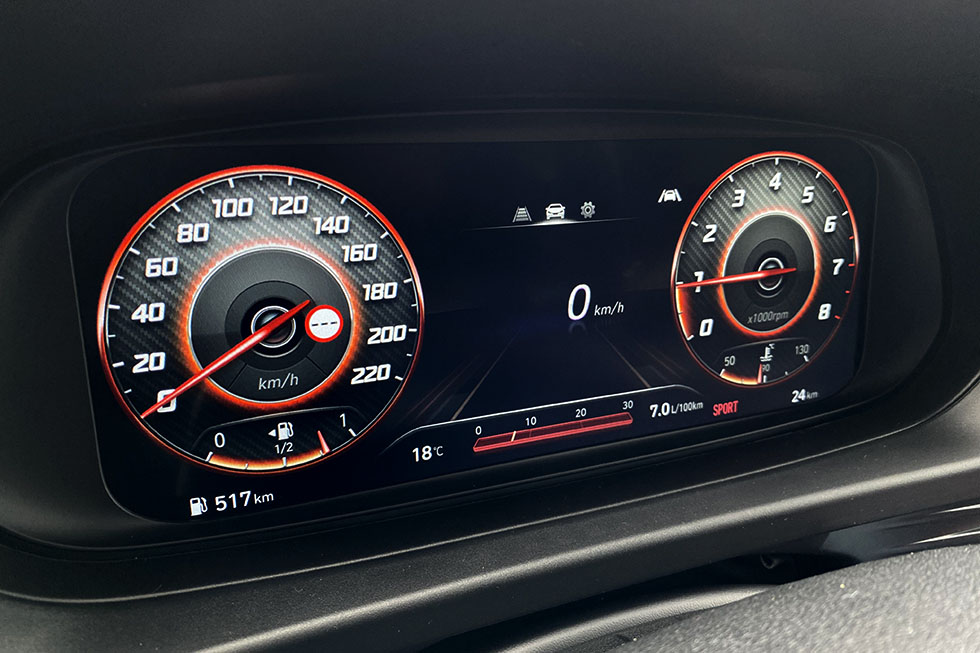 As jantes de 17 polegadas e o motor tri-cilíndrico fazem com que o ritmo se possa tornar mais divertido e sem grandes aventuras, demonstrando que a dinâmica também foi dos pontos em que este modelo evoluiu bastante. A suspensão um pouco mais firme tolera bem a maioria das irregularidades do piso e não se importa que a estrada fique um pouco mais sinuosa, ainda que, para devorar curvas, a marca também conte com uma versão N na sua gama, com o dobro da potência deste 1.0 T-GDi. Ainda assim, os dois modos de condução disponíveis permitem que a resposta ao pedal do lado direito se possa tornar mais imediata, ao mesmo tempo que transforma o visual do painel de instrumentos para um ambiente, também ele mais desportivo. E depois, há momentos em que o ruído dos três cilindros até parece tentar ter uma “voz” mais grossa, ao jeito de um desportivo, mas a filosofia deste modelo é mesmo oferecer a melhor das companhias a uma pequena família na sua rotina diária, em vez de ser o automóvel perfeito para uma condução mais emotiva.