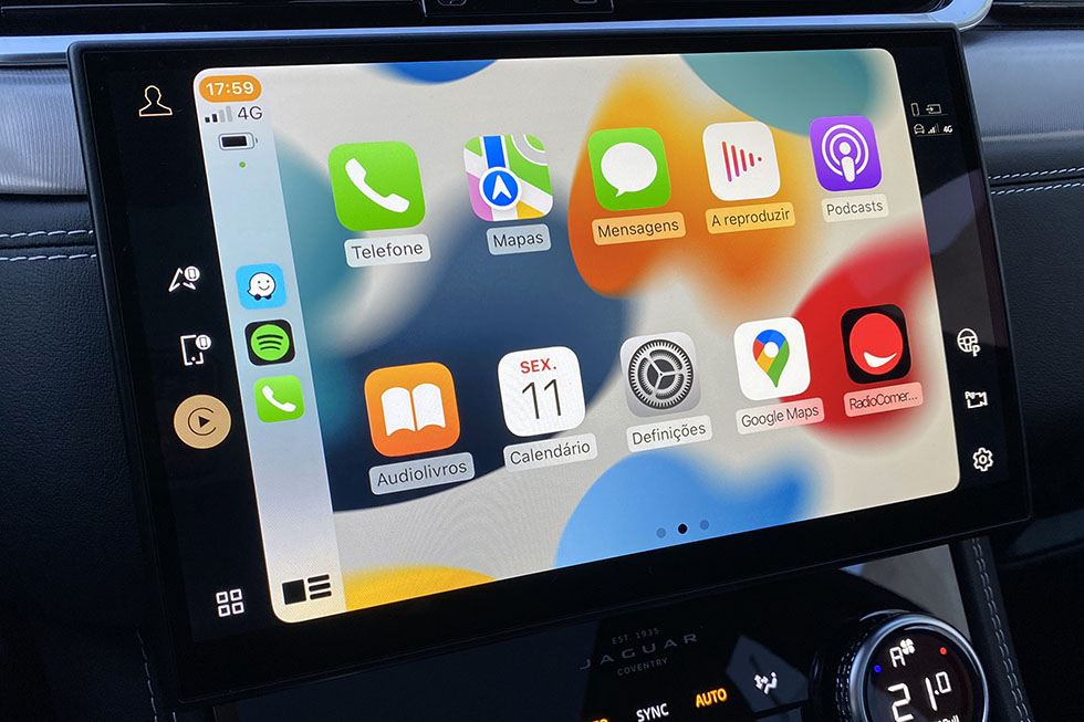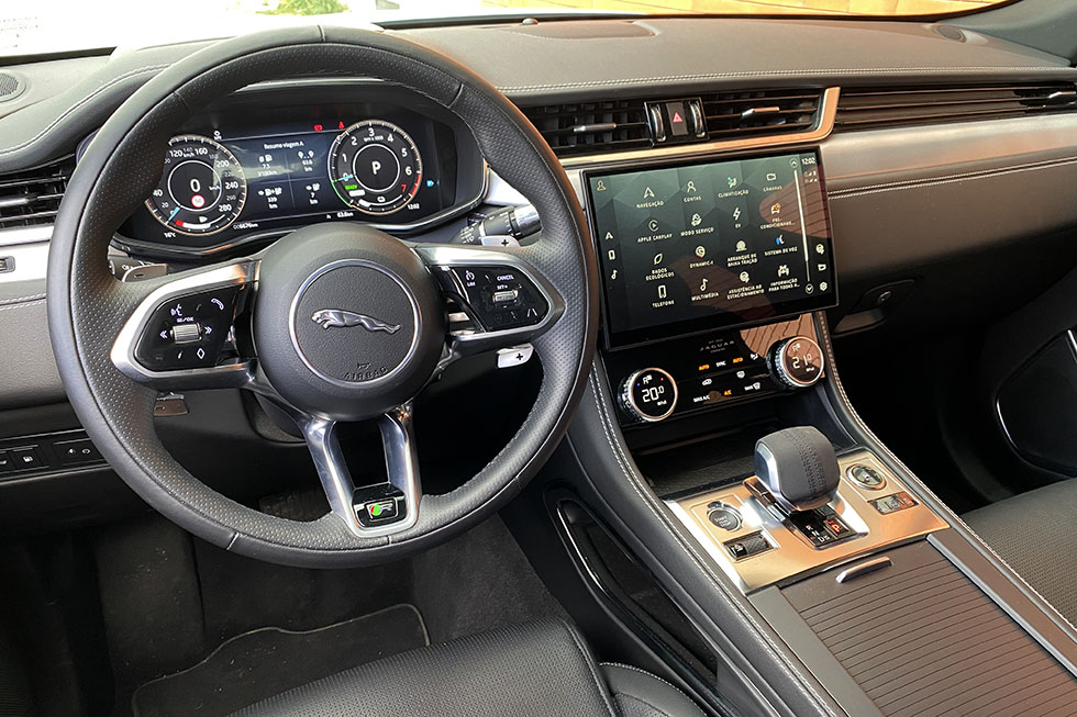 Os quatro modos de condução disponíveis têm a missão de personalizar a experiência de condução, mas confessamos que em 80% do tempo acabamos por usar o Confort, pré-definido assim que ligamos o F-Pace e também o que acaba por gerir o sistema híbrido de uma forma quase automática. E na percentagem restante, estão os momentos em que selecionamos o modo mais desportivo, com o objetivo de melhorar a resposta ao pedal direito e a agilidade das quase 2,2 toneladas deste F-Pace, ao mesmo tempo que o sistema de som nos oferece uma sonoridade mais envolvente e desportiva nas acelerações.