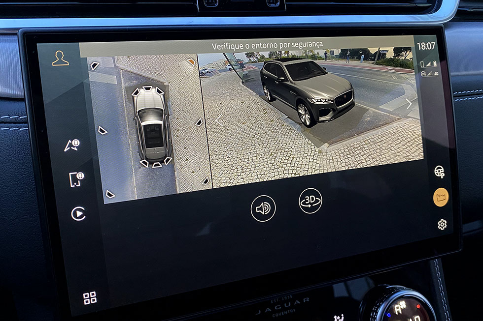 Se estacionarmos o F-Pace e começarmos a descobrir a quantidade de sistemas e funções existentes no monitor central, fica garantido que vamos ficar aqui sentados durante algum tempo. Começando pela configuração do telefone através do Apple CarPlay ou Android Auto, mas passando de imediato para as inúmeras visualizações das camaras do sistema de 360 graus, o monitor central revela uma enorme qualidade e facilidade de utilização. E depois, podemos configurar o modo de condução mais desportivo, ao qual não falta um cronómetro e um medidor de forças G, mas também explorar o que nos permite efetuar uma condução mais económica ou as definições do lado elétrico do sistema híbrido. E tudo isto, ao mesmo tempo que usamos o sistema de som da Meridian.