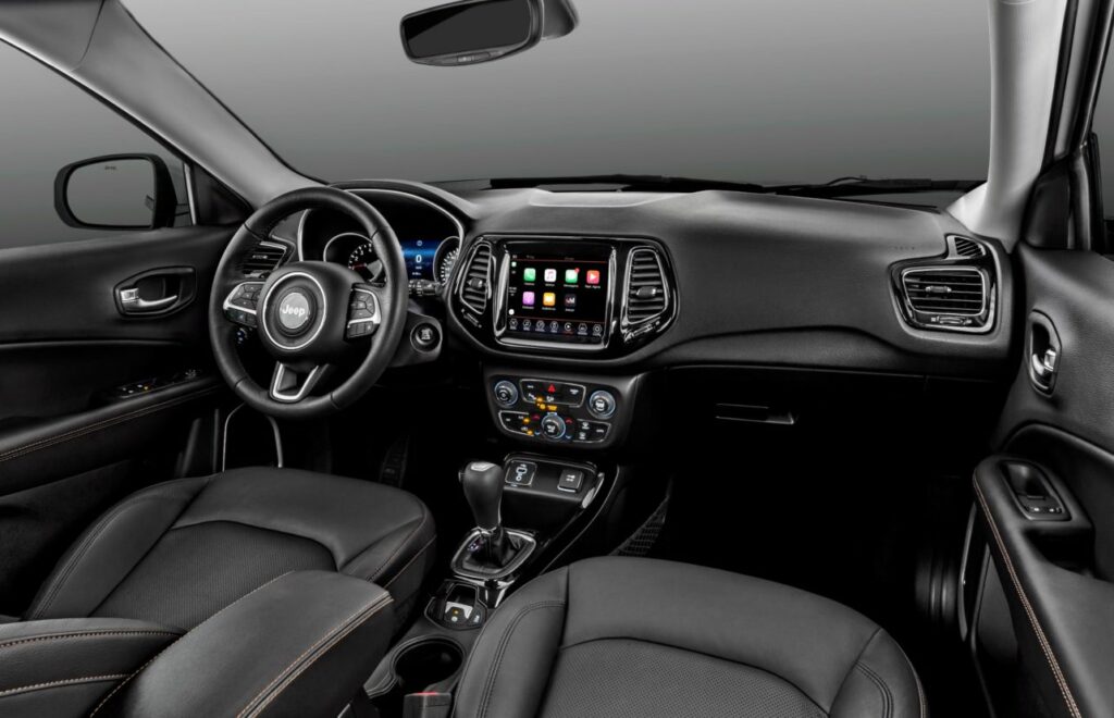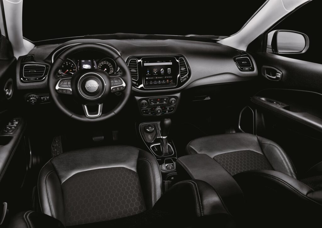 Esteticamente personalizado no exterior, o Jeep Compass Night Eagle adopta uma imagem um pouco mais “familiar” no interior, desde logo, ao exibir um design em tudo idêntico ao do Cherokee – marcado não somente por linhas funcionais e ergonómicas, como também por uma boa qualidade de construção. Qualidades a que esta versão em concreto acrescenta as particularidades que a suportam, como é o caso das molduras das saídas de ar e do ecrã táctil do sistema de info-entretenimento Uconnect (que, opcionalmente, pode ser de 8″) na cor preta, ou ainda dos plásticos que revestem o túnel de transmissão, na mesma cor.