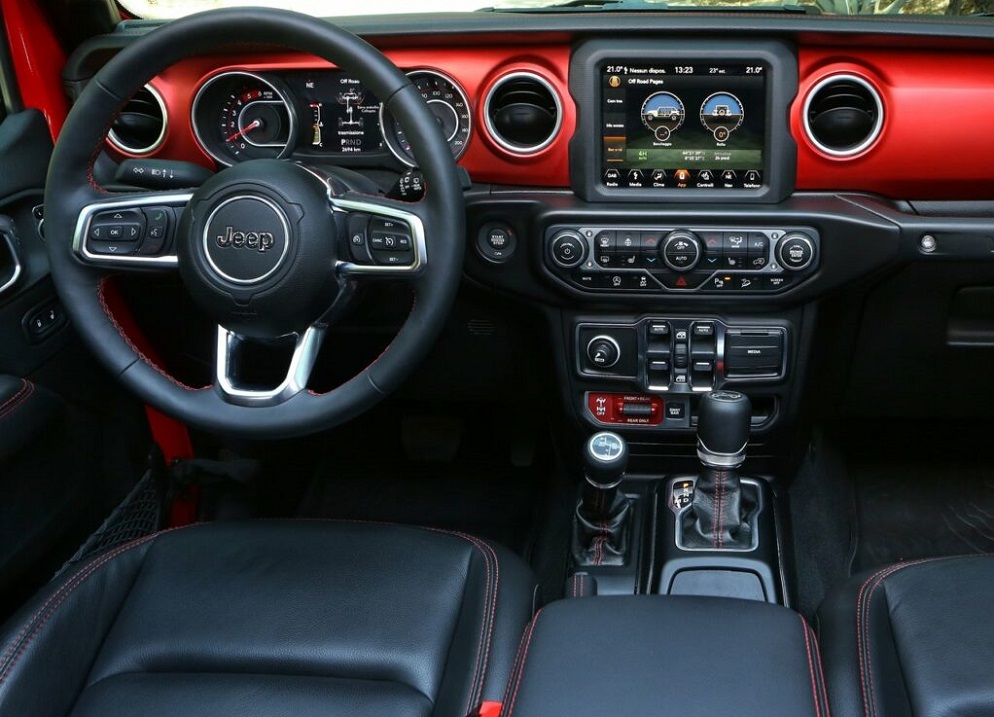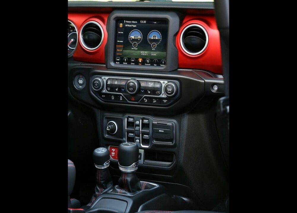 O Wrangler Rubicon não está nada mal equipado. A unidade que ensaiei tinha como extras o “hard top” removível (1.600 euros), pacote de lançamento (1.800 euros), pintura vermelha Firecracker (950 euros) e estofos em pele (1.400 euros). Oferecido de série, encontramos o ecrã TFT de 7 polegadas, sistema de informação Jeep no painel de controlo, sistema áudio Premium Alpine com 9 altifalantes, volante em pele com comandos, sistema multimédia Uconnect 8,4 polegadas com sistema de navegação e MP3, AUX, USB e Bluetooth, serviços Uconnect Live, cruise control, espelho retrovisor electrocromático, espelhos exteriores aquecidos, acesso e arranque sem mãos, ar condicionado automático bi zona, regulação manual do banco do condutor, bancos dianteiros com regulação manual, jantes de liga leve de 17 polegadas, sistema de desligar da barra estabilizadora, controlo de descida em declive, sistema Tru-Lock no eixo dianteiro e traseiro, eixos Dana, sensores de estacionamento e câmara traseira.
