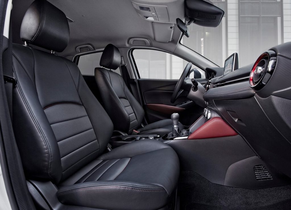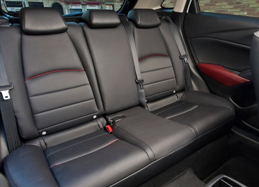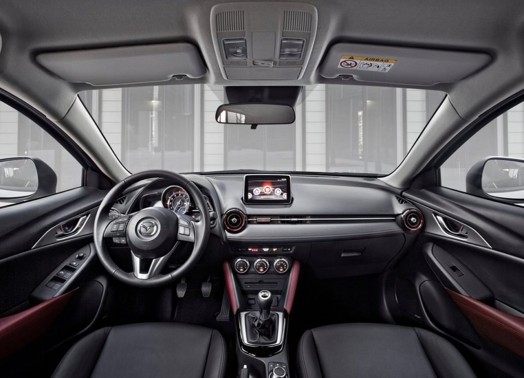 Mantendo a filosofia minimalista, o painel de instrumentos do anterior modelo, posição de condução e habitabilidade, a Mazda redesenhou a consola central, tirou o travão de mão mecânico e colocou um botão que faz o mesmo efeito e liberta muito espaço, há mais espaço para arrumação de pequenas coisas e o apoio de braços é bem-vindo. O espaço habitável não é enorme, ficando a par com utilitário e na bagageira há mais 100 litros que no Mazda 2 (350 litros, expansíveis a 1260 litros com o rebatimento do banco traseiro) e para trás não se quase nada, cortesia das sensuais linhas da carroçaria. Os sensores de estacionamento são mais valia a não desprezar. O sistema de info entretenimento foi atualizado, mas envelheceu umas décadas, face ao que o Mazda 3 apresentou. Infelizmente, não deve chegar a esta geração do CX-3, mas só na próxima geração. A Mazda incrementou a qualidade do interior, mas continuam alguns plásticos continuam a ser pobres, muito por culpa da filosofia Skyactiv. Eu explico. Com um chassis tão composto, rígido e com pouco NHV (Barulho, Aspereza e Vibrações), a Mazda não sentiu necessidade de investir na qualidade percecionada. Um erro que foi mitigado, mas que só será corrigido na próxima geração. Por outro lado, é necessário manter os preços acessíveis – a imagem de marca da Mazda não é, vá lá saber-se- porquê, igual à de outros construtores – e isso só é possível com algumas concessões. Uma delas reside nos plásticos que, em algumas zonas, apesar da melhoria, são fracos. No banco traseiro, o apoio de braços passa a ter dois porta copos e não um espaço de arrumação. A arrumação da consola central modificou a ergonomia, para melhor, mas tudo o resto ficou praticamente na mesma com mais umas zonas almofadadas nos apoios de braços. O espelho retrovisor interior é novo com sistema anti encadeamento, os aros em volta dos orifícios da climatização podem ser coloridos, com o sistema MZD Connect, há Apple CarPlay e Android Auto e pouco mais.