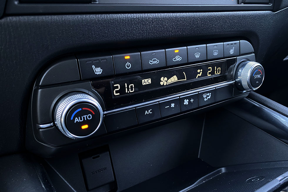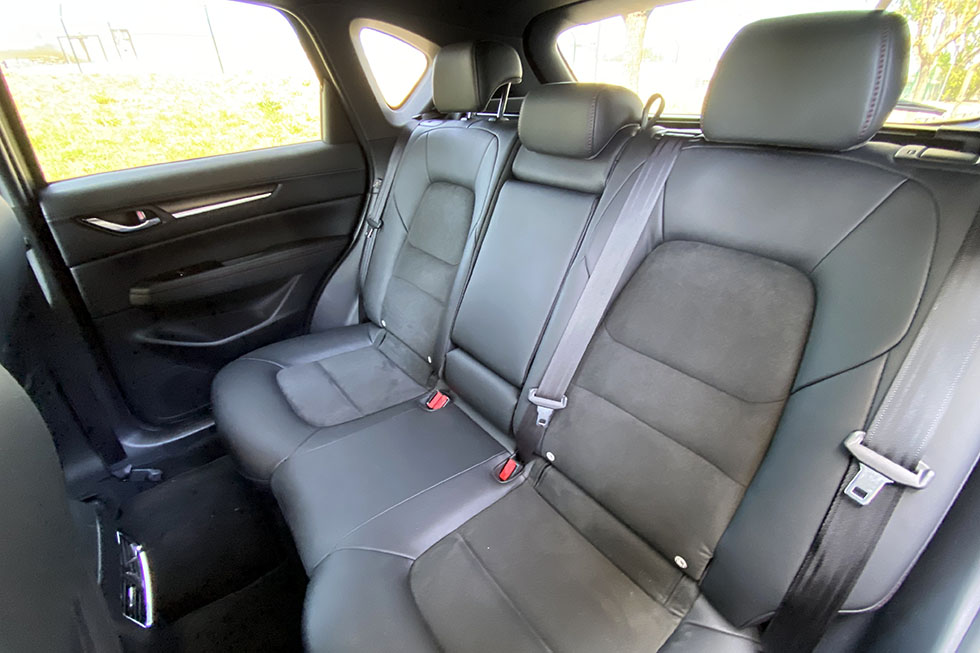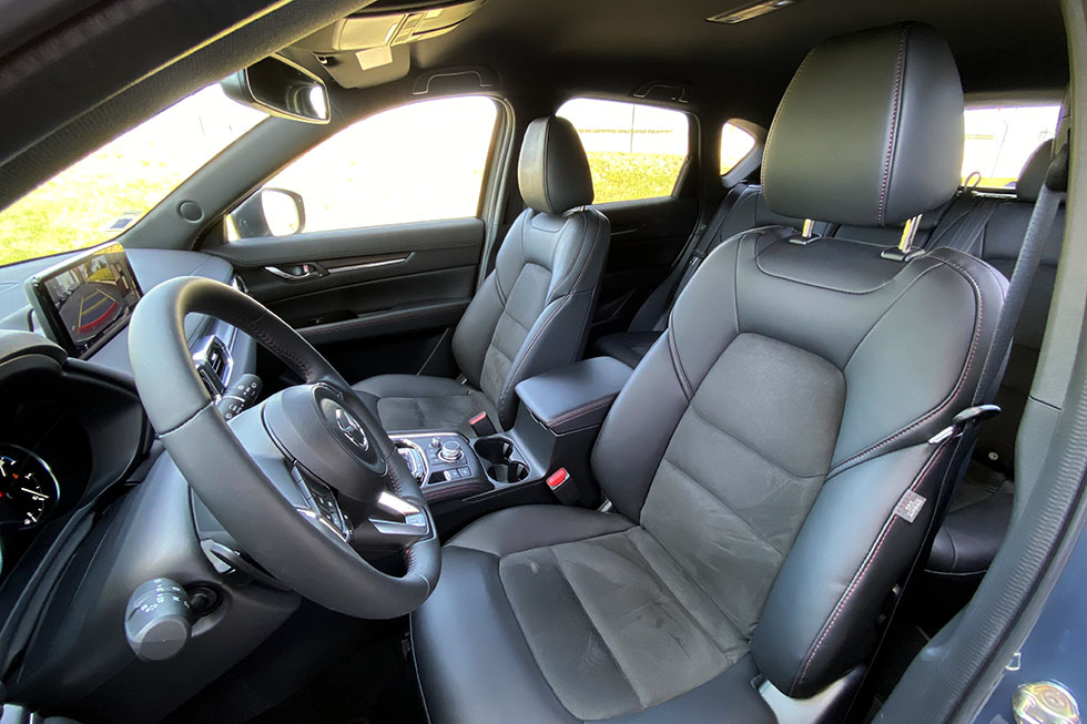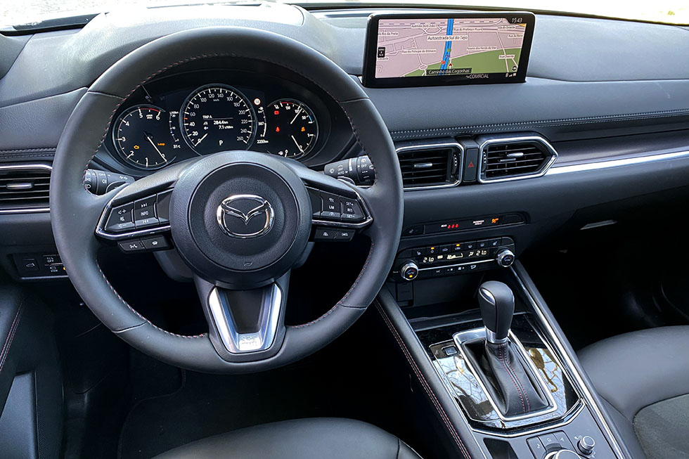 Com o nível de equipamento Homura, o recheio do CX-5 fica mais ou menos a meio de tudo aquilo que a marca oferece para este modelo. Mas mesmo no patamar intermédio, aquilo que não temos é a imagem mais clássica dos assentos em pele e sim um visual mais desportivo com os tons escuros a bordo, as costuras vermelhas e os assentos forrados parcialmente em couro e camurça artificial. Em termos de opções, adicionaríamos apenas o sistema de som da Bose que a unidade ensaiada não incluía, mas que está disponível em opção e a possibilidade de se poder usar o Apple CarPlay ou Android Auto numa versão sem fios, uma vez que está disponível um carregador por indução na consola central, não fazendo sentido ter um cabo ligado. Como adição ao preço da unidade ensaiada, está apenas o valor da pintura Polymetal Grey e o da caixa de velocidades automática.